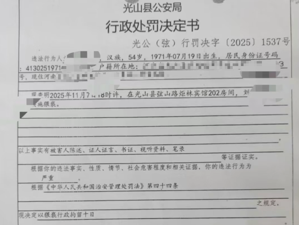 11月19日,光山县公安局以猥亵对刘某处以行政拘留10日的处罚。