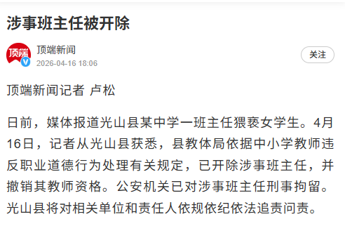 近日,“54岁班主任猥亵15岁女孩事件”引发关注。4月16日晚,据媒体报道:日前,媒体报道光山县某中学一班主任猥亵女学生。
