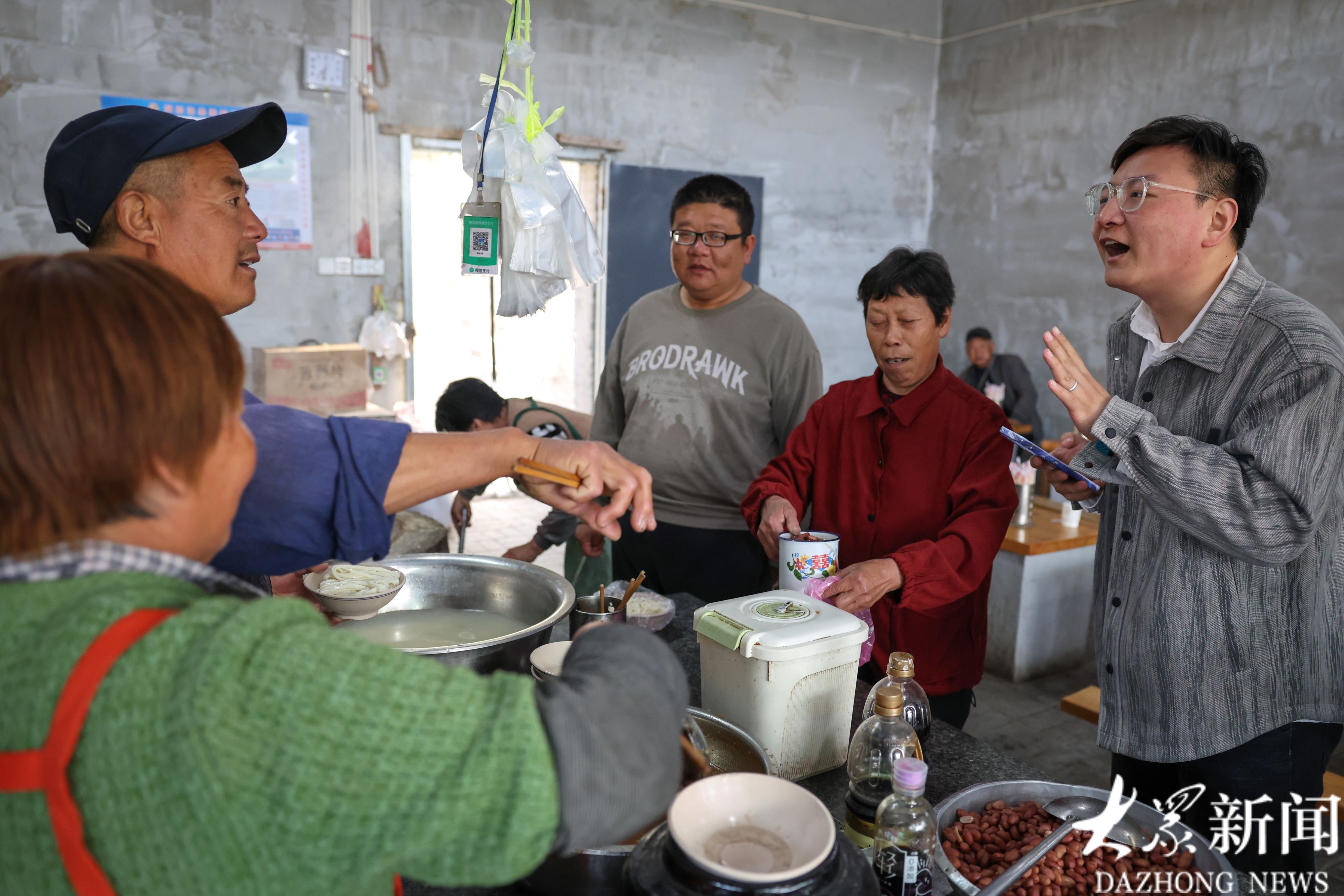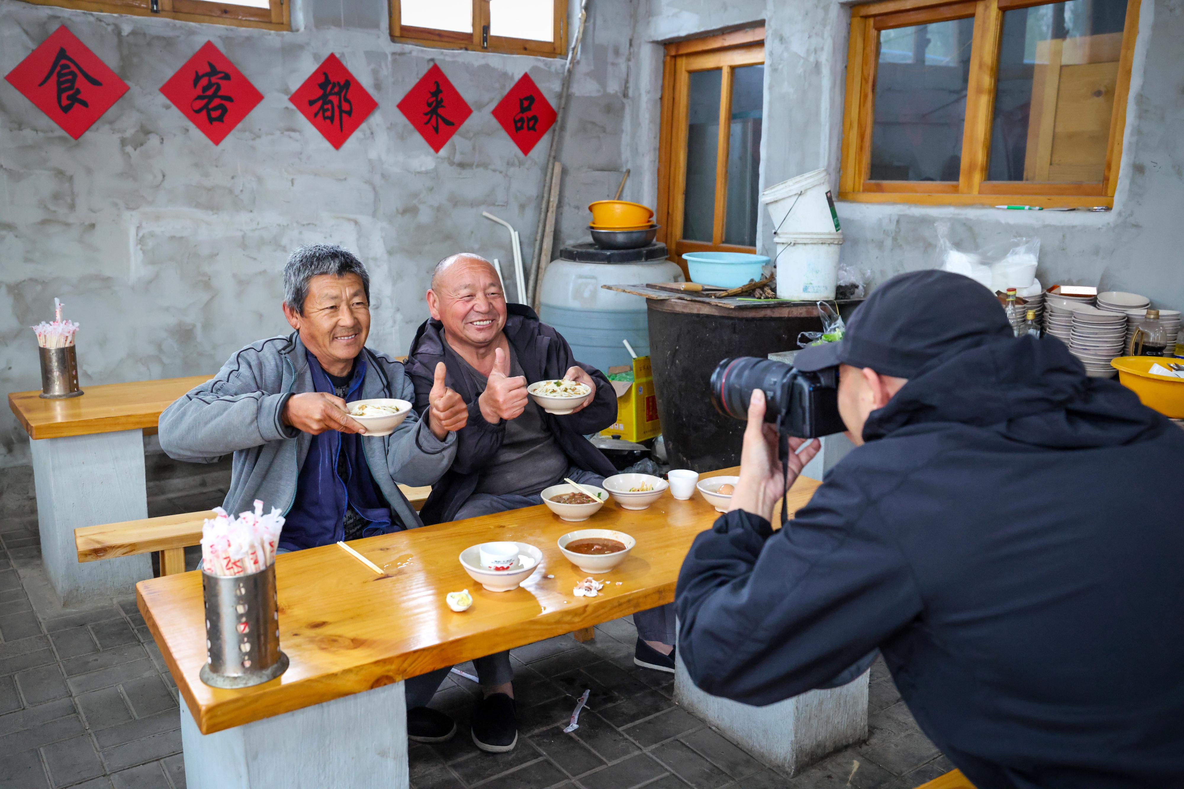 记者向吃面的顾客提出拍摄要求,大家一听为面馆代言,纷纷主动配合拍摄。