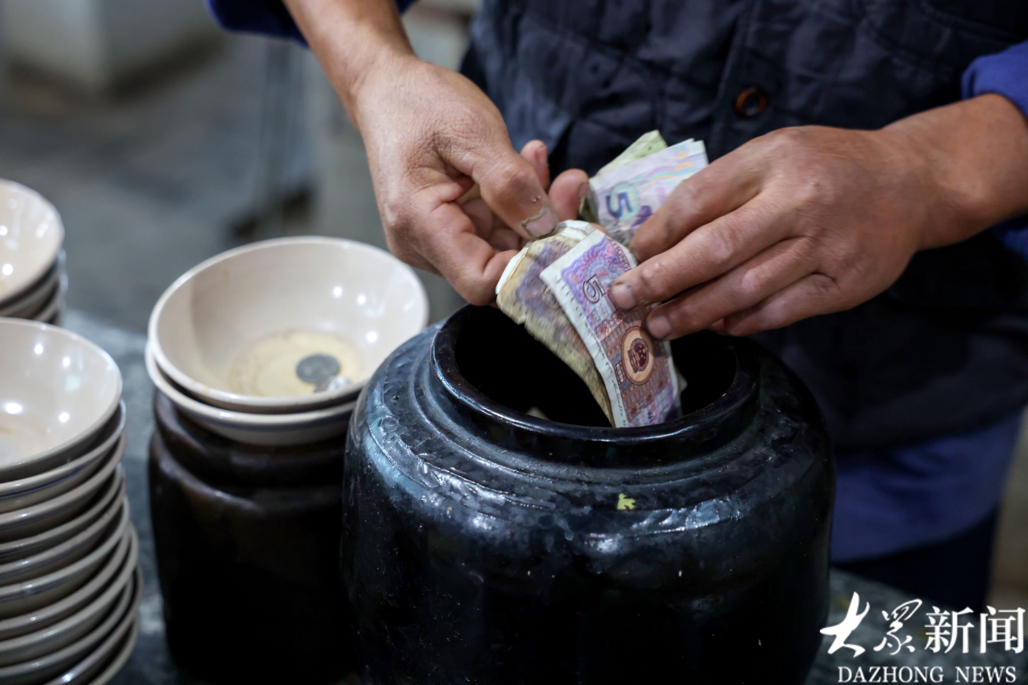 刘荣学的面馆用坛子盛零钱,这个钱坛子已经油光发亮了。