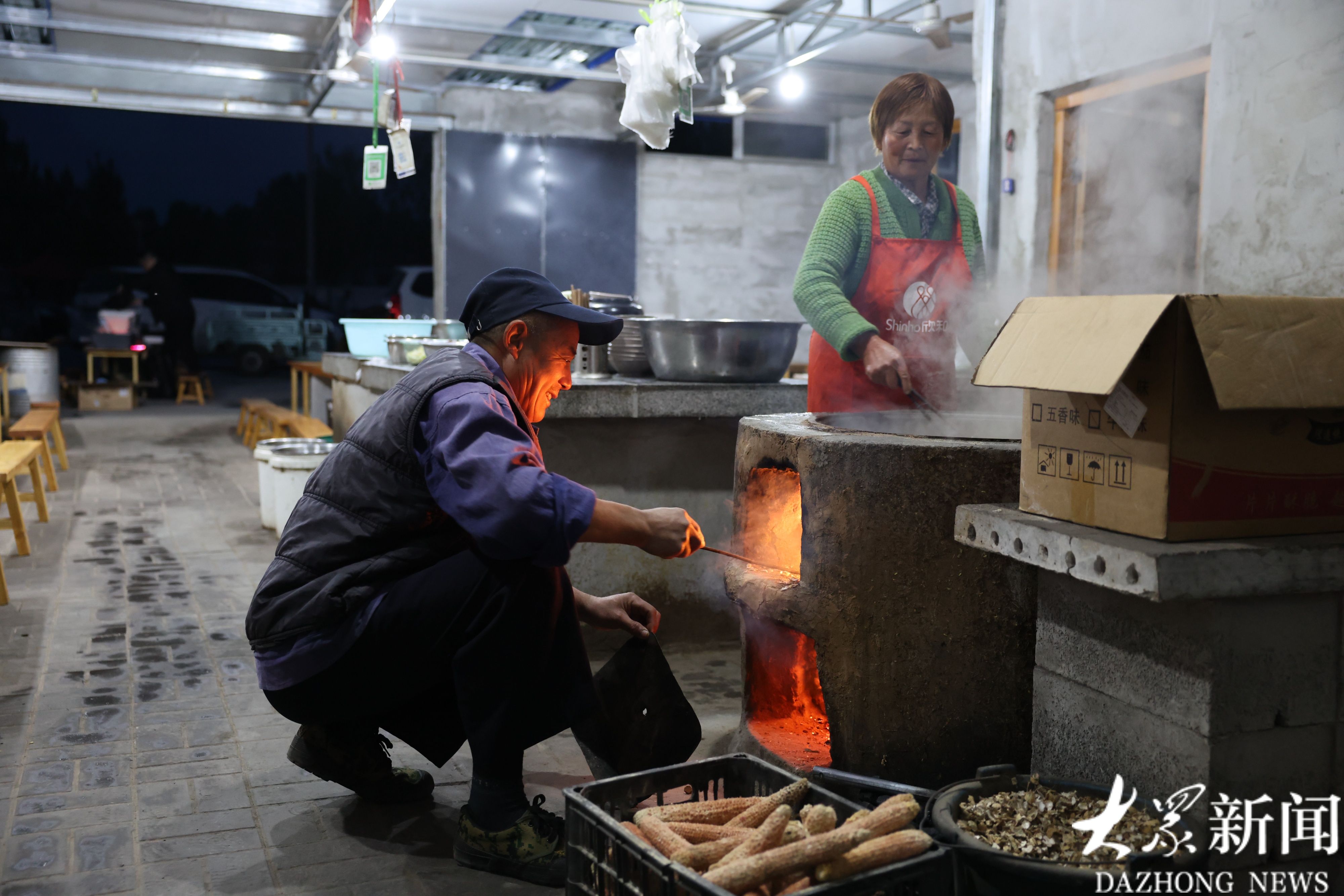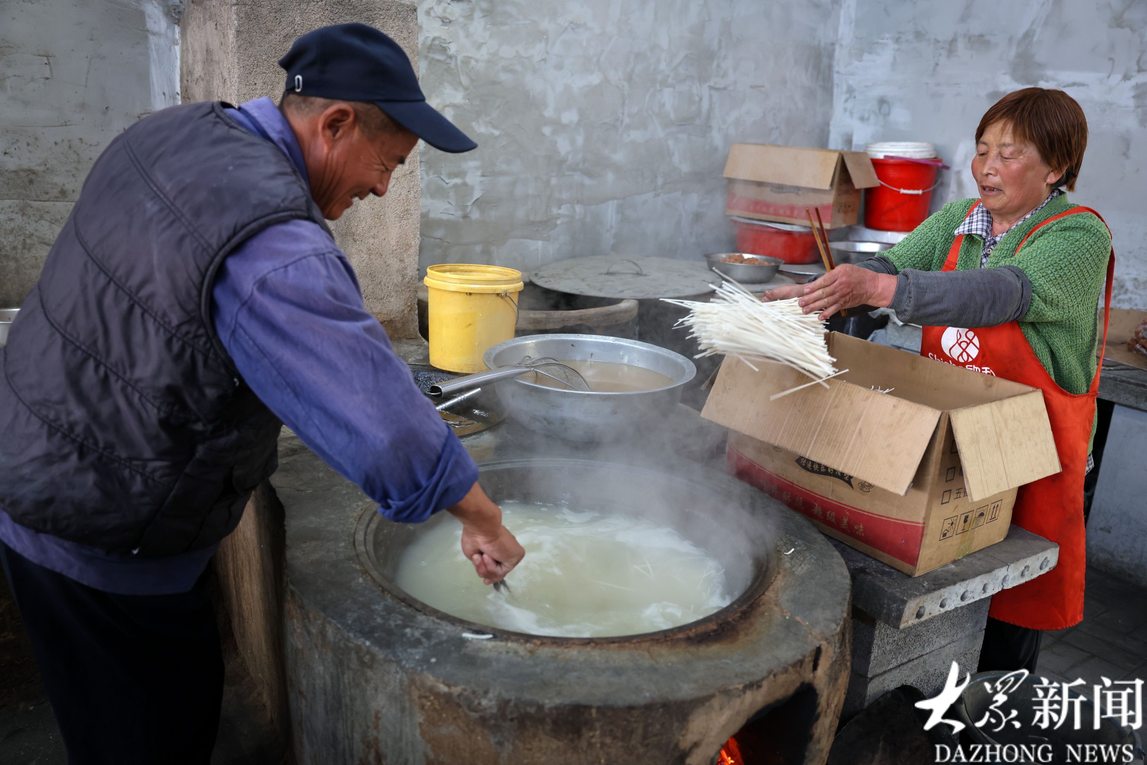 大铁锅前,刘荣学添柴加火,妻子煮面。
