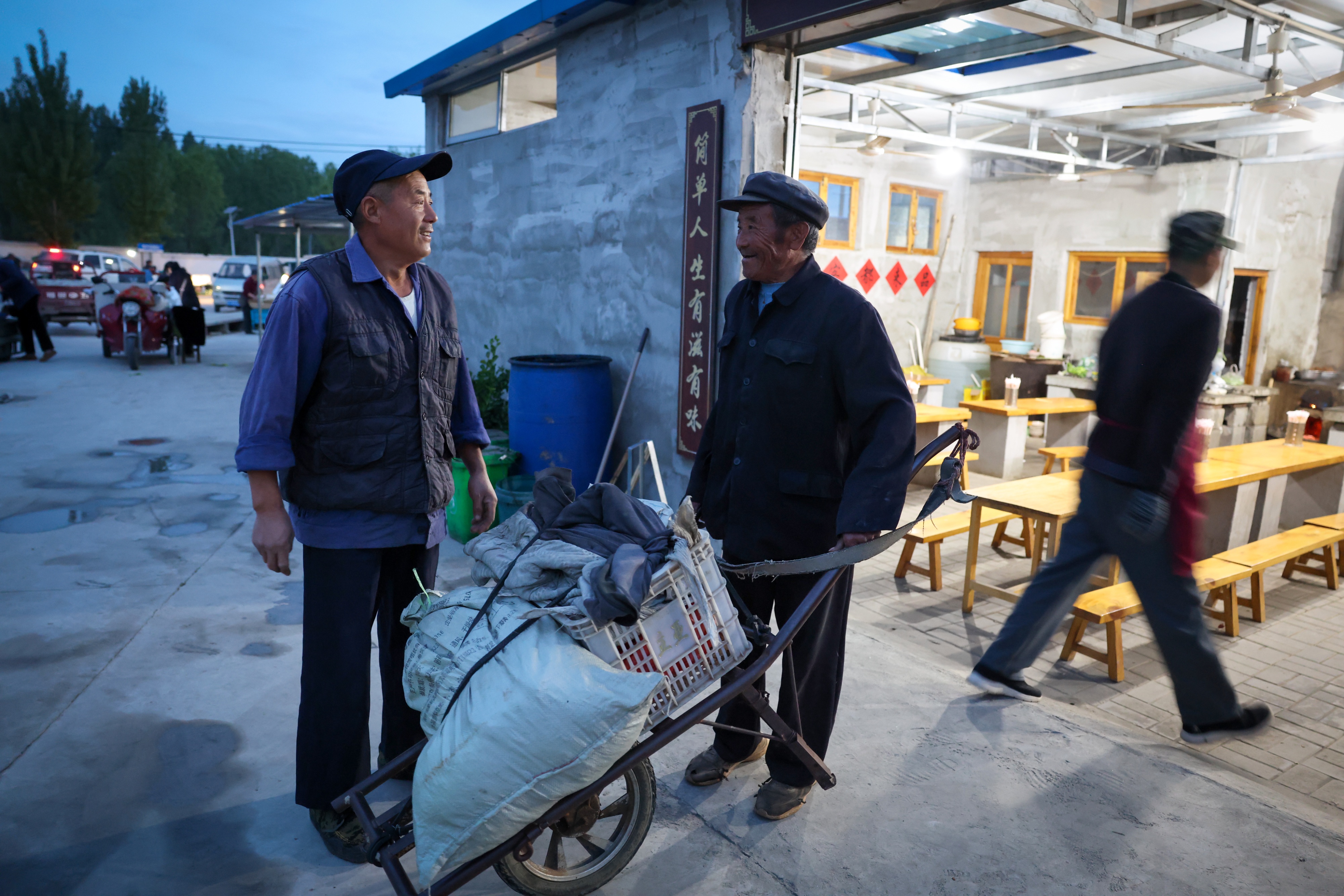 天蒙蒙亮,推车步行30多里来赶集的薛玉恩(音)来到面馆前,先和刘荣学聊起了天。