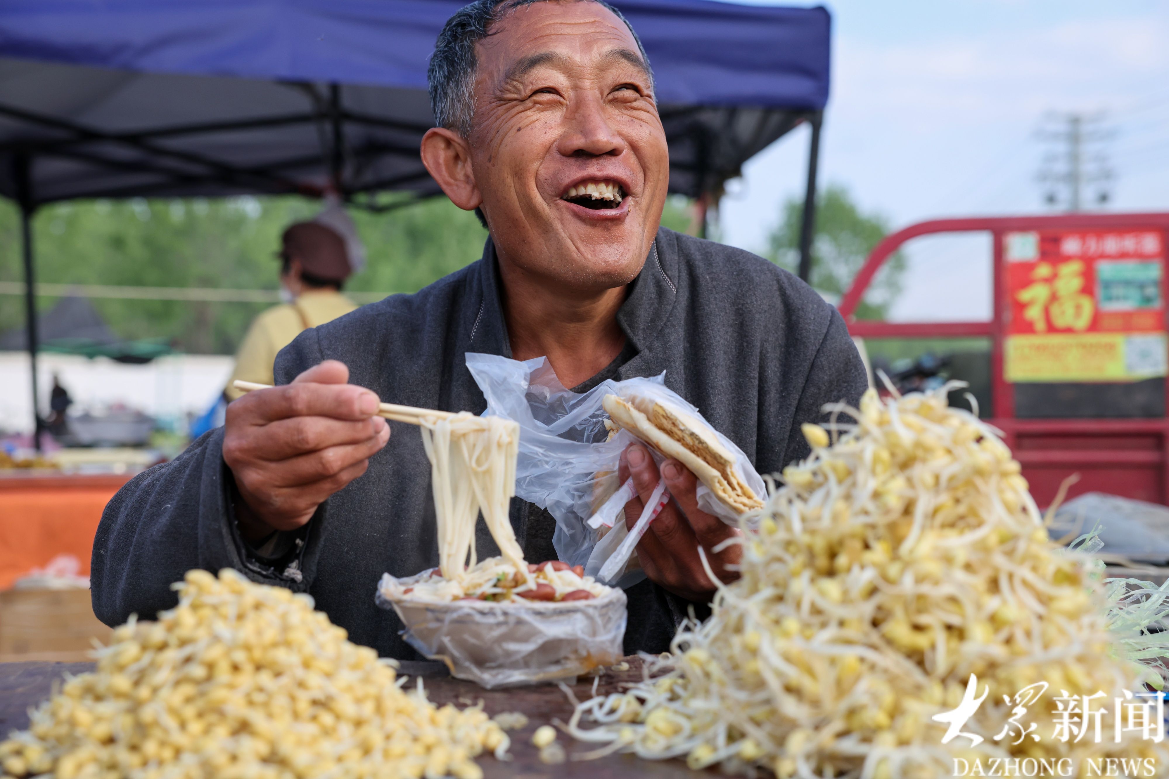 60岁的任师傅赶集卖豆芽,他买了面在摊位上吃了起来,记者为他拍下代言照。