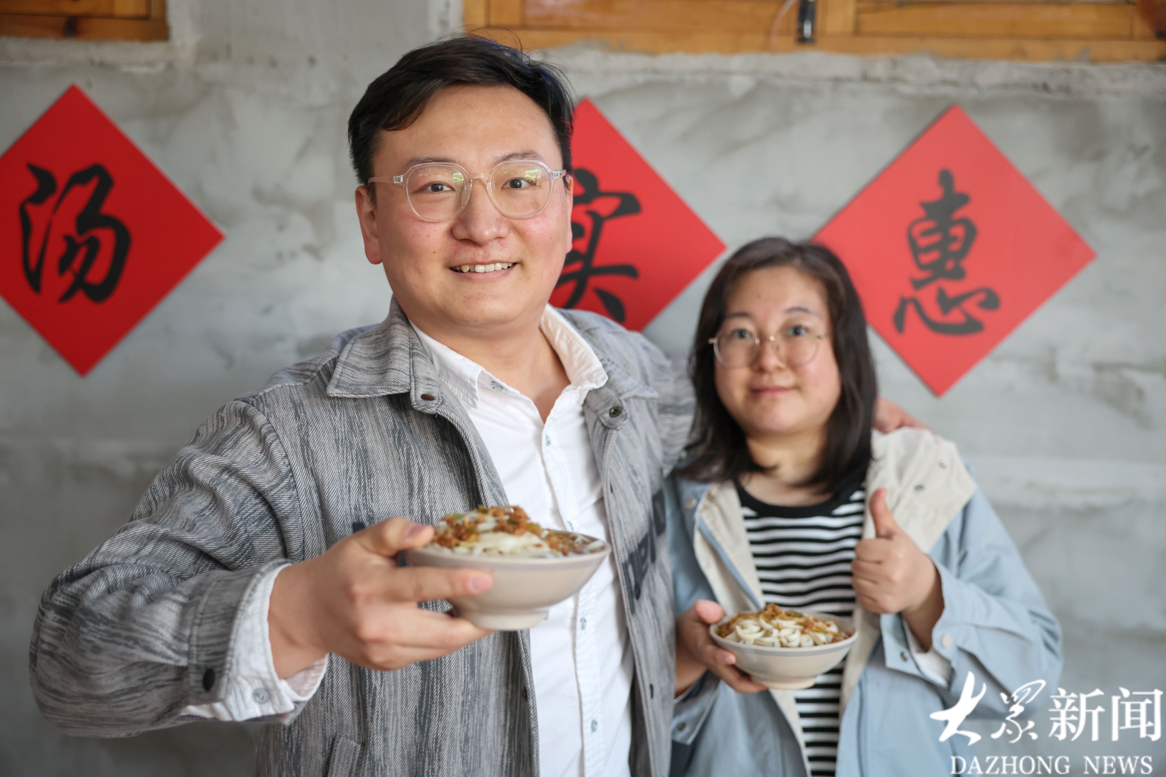 刘守邦夫妻特地从新泰市里赶来吃面,听说可以为面馆代言,立即端起了面。