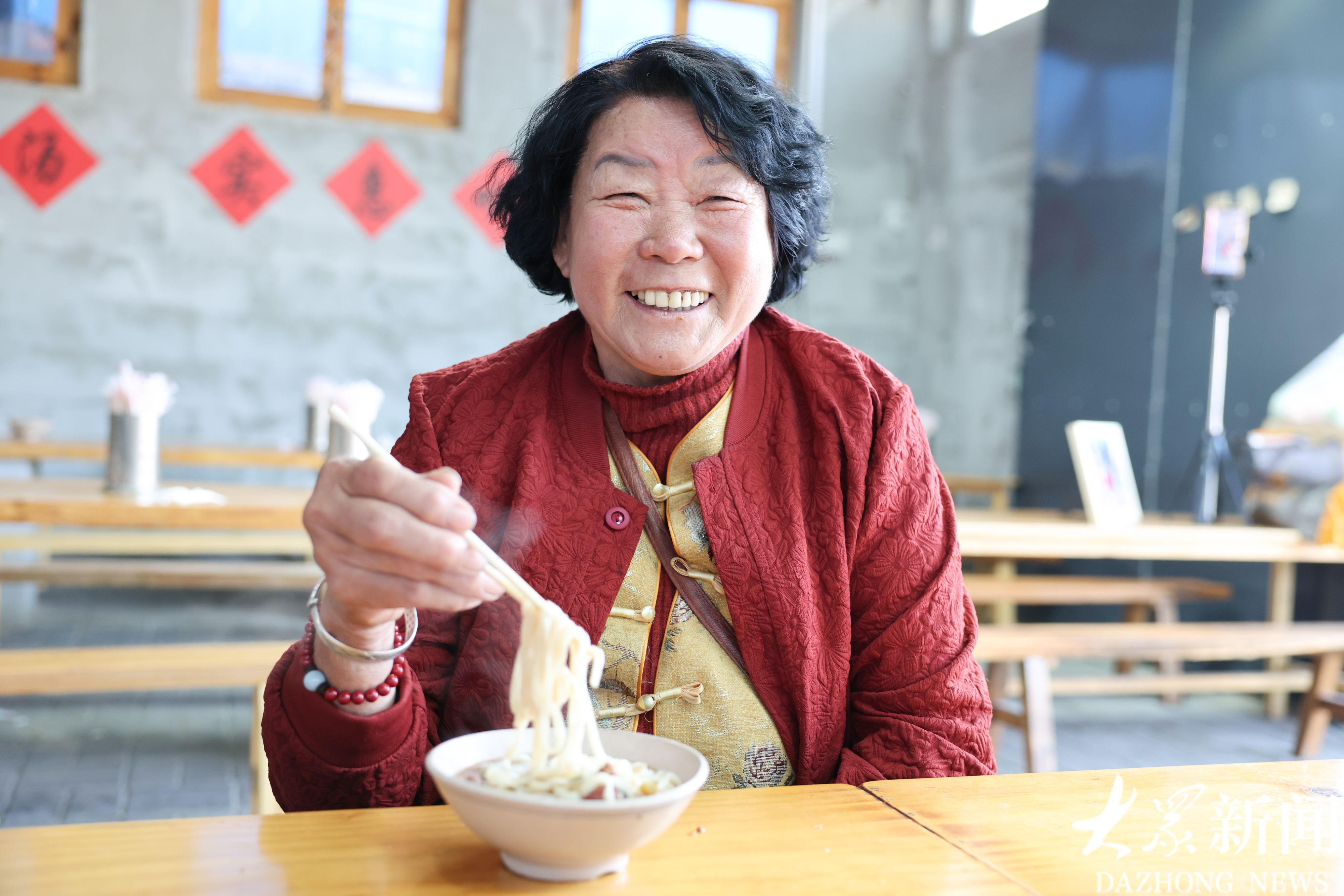 八十岁的薛玉恩笑得满脸褶皱;卖菜的陈师傅、聂师傅纷纷竖起大拇指;赶集的一家三口、从新泰市区专程赶来的夫妻、带着两岁孩子的食客,人人都愿意为这家暖心面馆代言。刘荣学夫妻也一同入镜,留下了珍贵的合影。