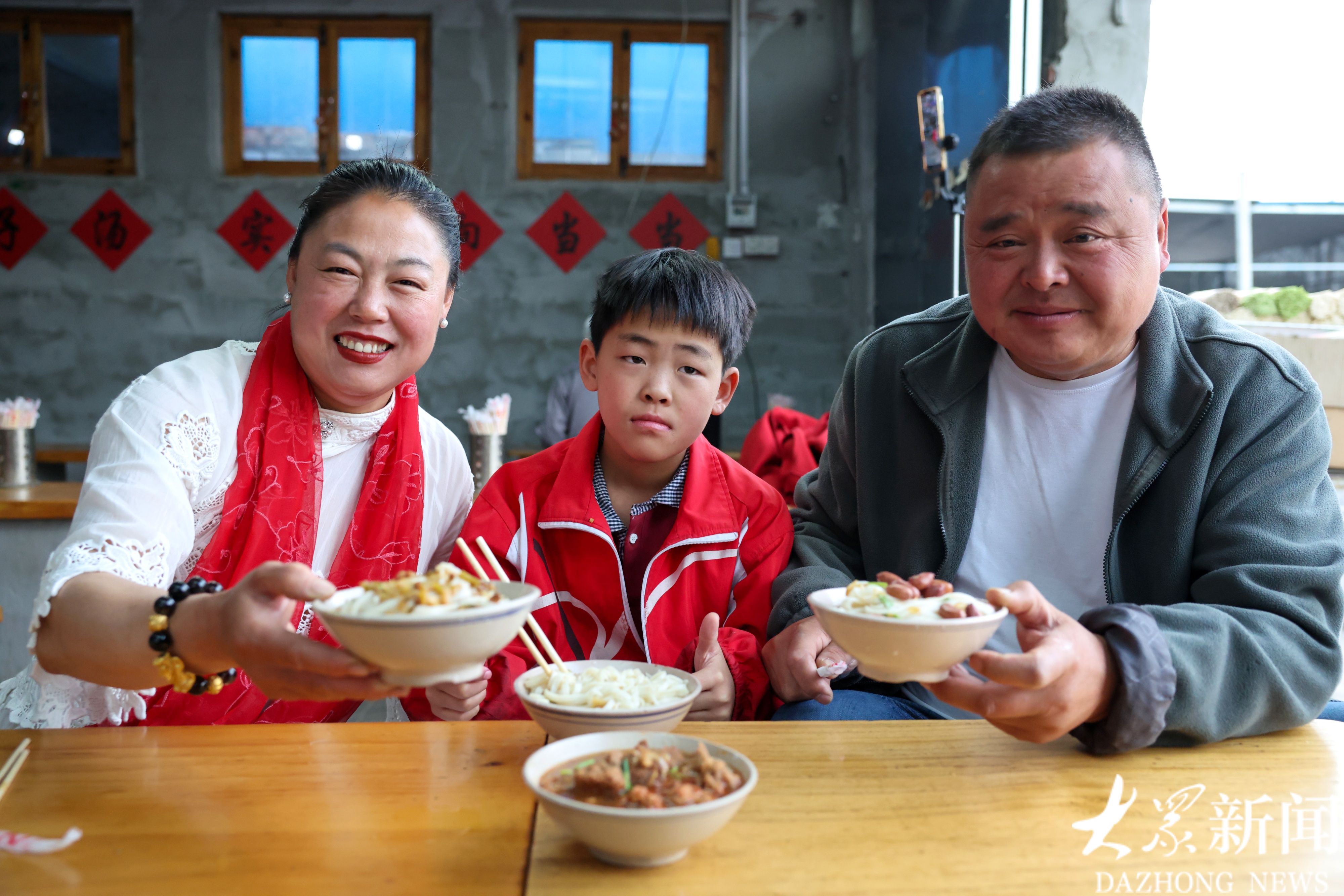 公茂华带着妻子和上四年级的孩子一起来吃面,记者为他们拍下代言照片。
