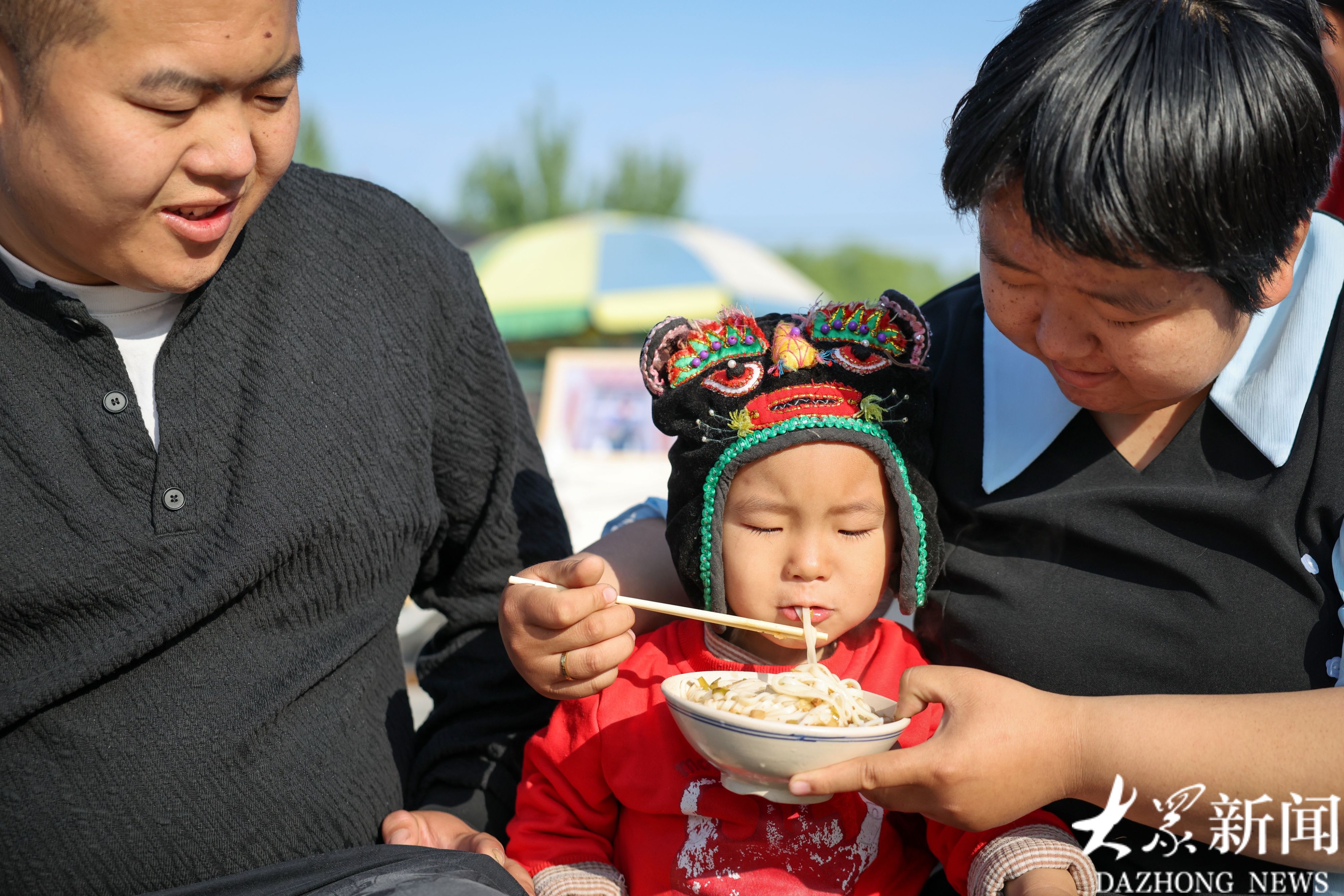 张绍轩(左)带着妻子和两岁的孩子丞丞来吃面,一家三口也乐意为面馆代言。