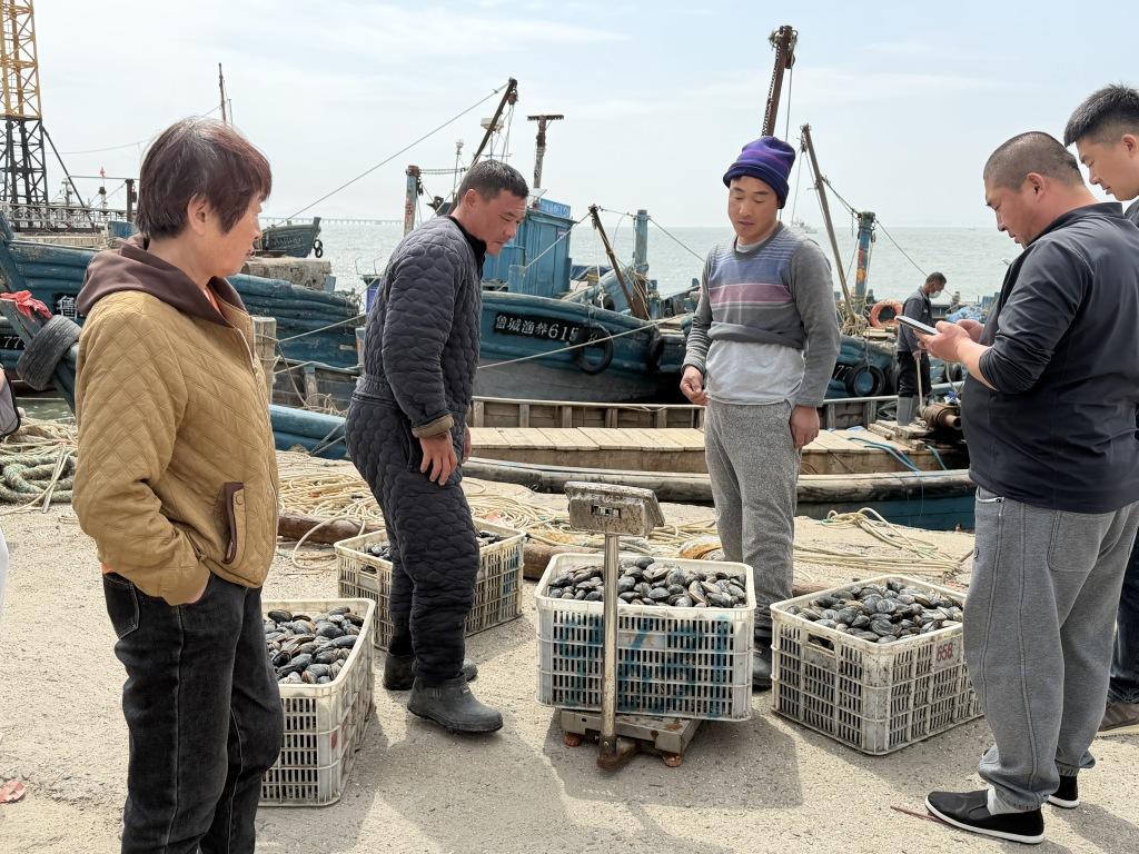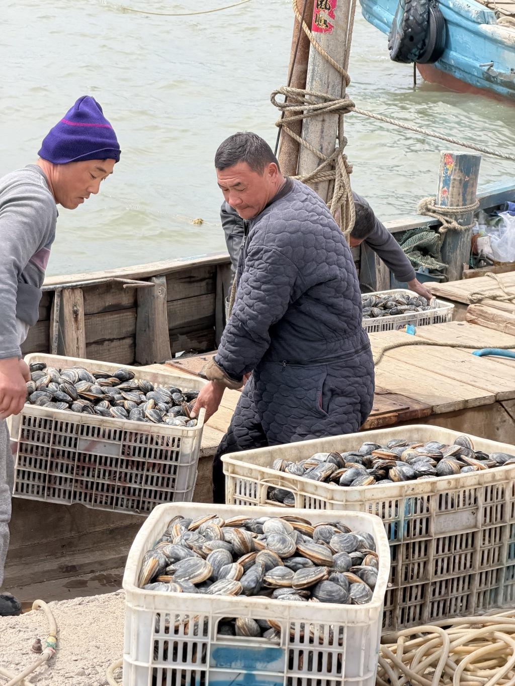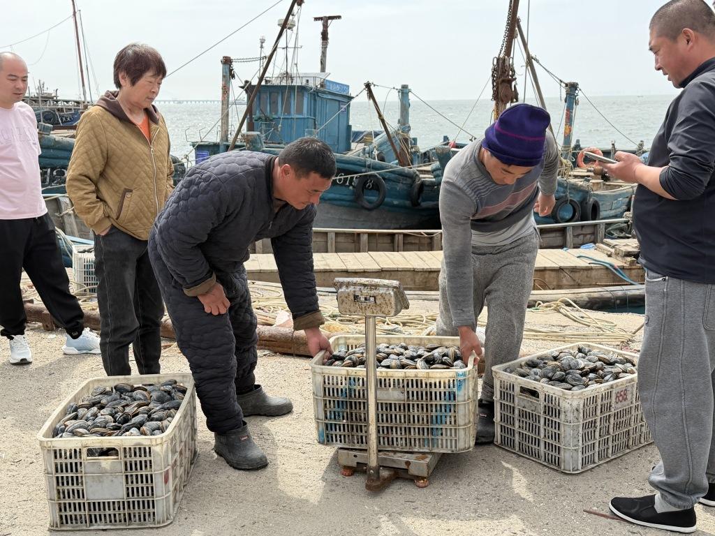 红岛渔港千余斤蚬母新鲜上岸 春日胶州湾海味正当时