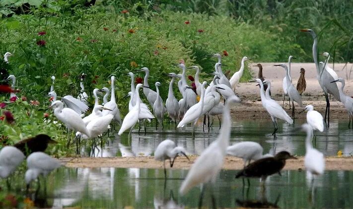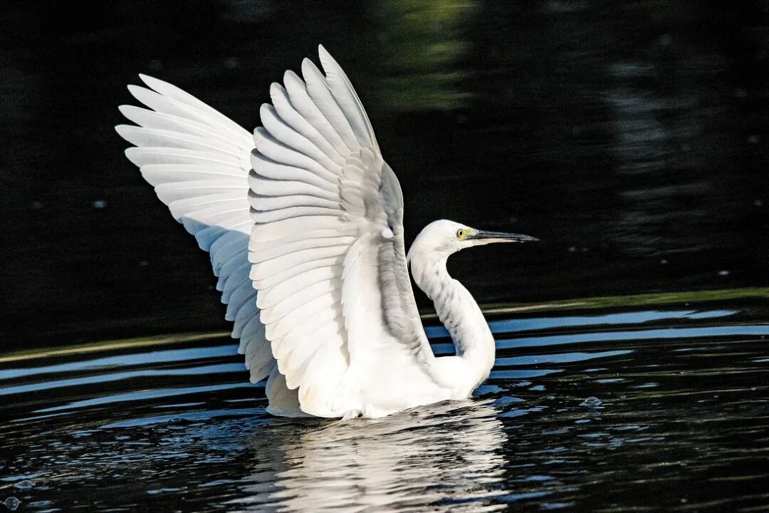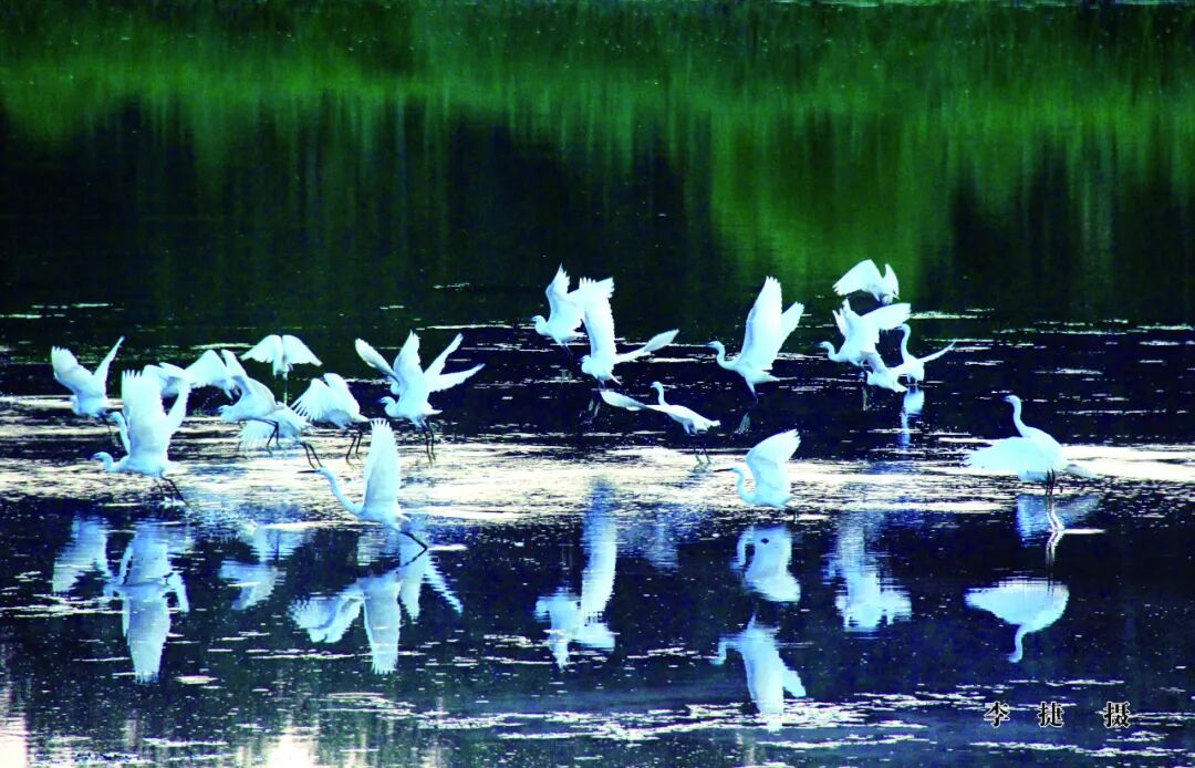 成群白鹭、苍鹭临水栖息、梳理羽衣,绘就“万羽栖湖”的动人画卷。四月,正值鹭鸟繁殖季,密林深处,亲鸟守护新生,万羽栖枝,如雪落翠林。“鸟从绿波出,人在画中游”,皆是眼前真实的自然盛景。