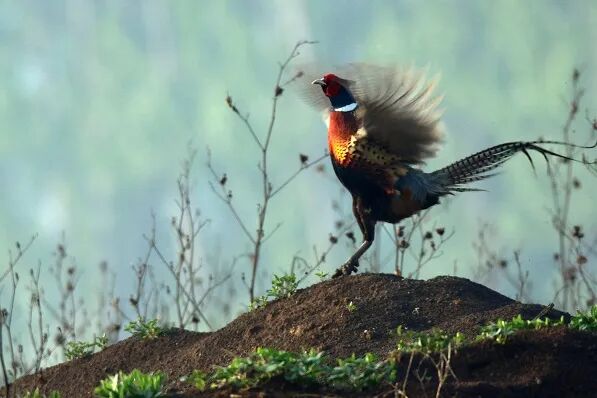 看!环颈雉振翅开屏,在高处起舞求偶。