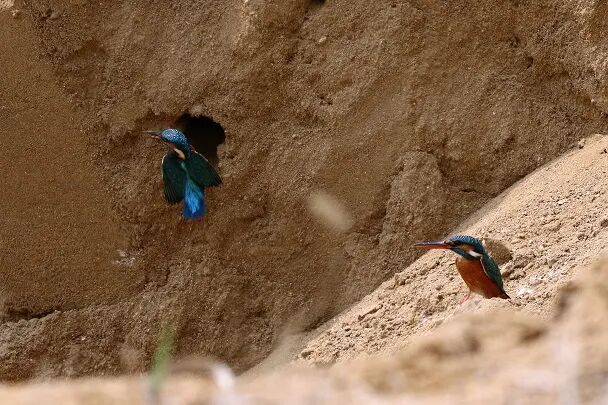 瞧!翠鸟穿梭巢穴,轮流守护、衔食育雏。