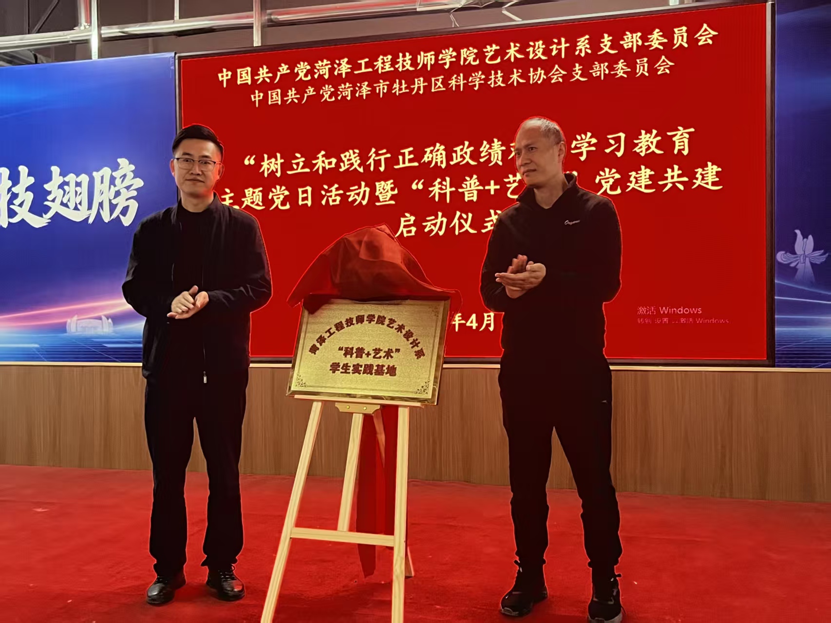 仪式上,牡丹区科协党支部书记王文义、菏泽工程技师学院艺术设计系党支部书记仝斐先后致辞,学院副院长王海民作讲话,强调以支部共建为纽带,通过共建,提升党支部的组织力和战斗力,切实推动“科普+艺术”融合发展,培养出更多既懂设计又爱科学的高素质技能人才。双方党支部书记签署共建协议,并为 “菏泽工程技师学院艺术设计系‘科普 + 艺术’学生实践基地” 揭牌,王海民宣布共建活动正式启动。
