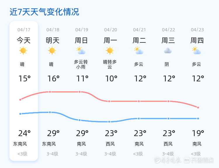 今天是4月17日,星期五,农历三月初一。东营市今天天气晴朗,气温适中,最高气温24℃,最低气温15℃。目前气温为13℃,南风1级,空气湿度为95%,PM2.5指数为104。各区天气情况一致,均为晴朗天气,适合市民出行和户外活动。
