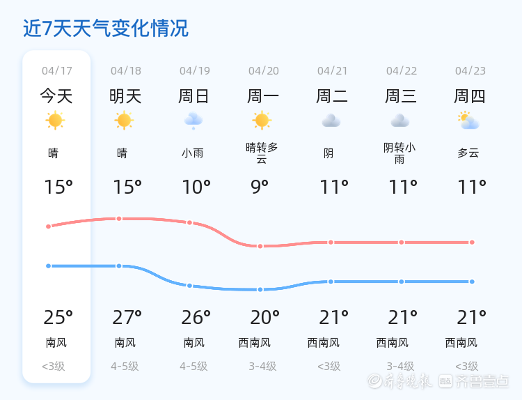 未来三天,德州天气将以晴到多云为主,但周日(4月19日)将有一次小雨天气过程,气温将小幅波动,最低气温降至10℃,最高气温维持在26℃左右。提醒市民注意天气变化,及时增减衣物,尤其是周日出行需携带雨具,防范降雨对交通的影响。