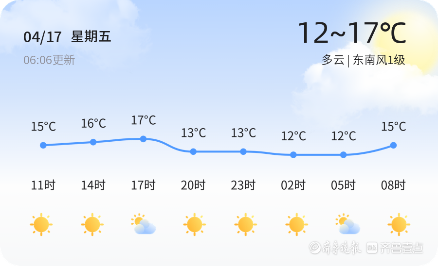 今天是4月17日,星期五,农历三月初一。威海市今日天气多云,东南风1级,温度介于12℃至17℃之间,空气湿度为100%。空气质量状况良好,PM2.5指数为40,属于良好级别,适合市民户外活动。出行建议市民可适当减少衣物,注意防晒和保暖,随身携带雨具以备不时之需。