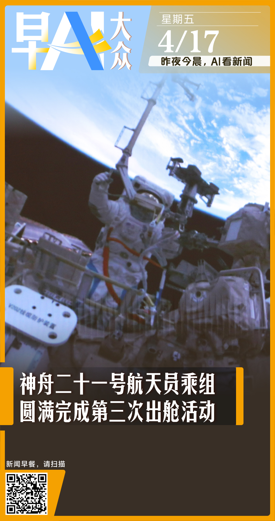 据中国载人航天工程办公室消息,北京时间2026年4月17日01时36分,经过约5.5小时的出舱活动,神舟二十一号乘组航天员张陆、武飞、张洪章密切协同,在空间站机械臂和地面科研人员的配合支持下,圆满完成空间碎片防护装置安装、舱外设备设施巡检等任务。出舱航天员张陆、武飞已安全返回问天实验舱,出舱活动取得圆满成功。截至目前,航天员张陆已累计进行7次出舱活动,刷新了中国航天员个人出舱活动次数的纪录。详情>>