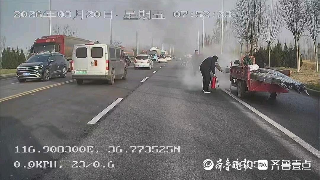 4月16日,情报员“强”向齐鲁晚报官方客户端齐鲁壹点情报站发来情报,近日,在济南梓东大道仓上村附近,一辆三轮车突发自燃,路过的K179路驾驶员王星园发现后立即下车灭火。