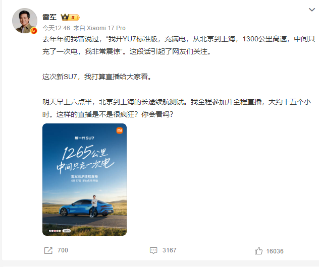 雷军表示,这次新SU7打算直播给大家看,他将全程参加并直播从北京到上海的长途续航测试,大约十五小时。