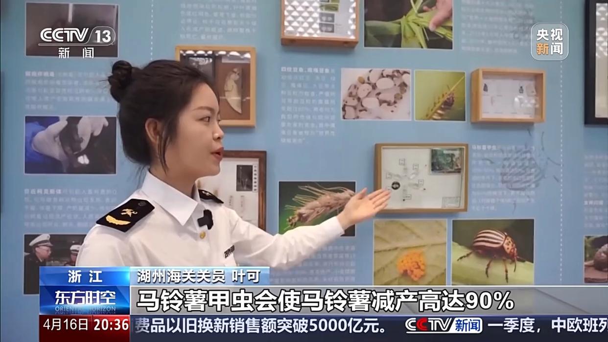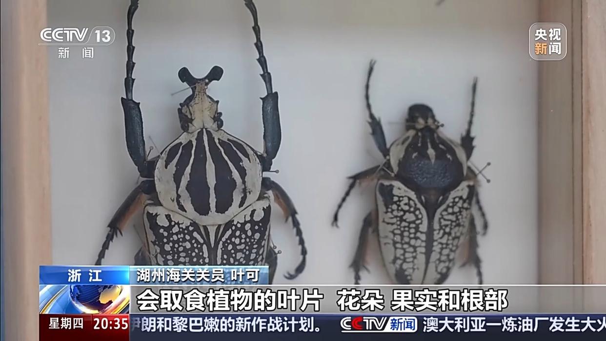 湖州海关关员 叶可:来自非洲的白纹大角金龟,它会取食植物的叶片、花朵、果实和根部,会严重影响植物的生长健康,甚至导致植物死亡,一旦逃逸、定殖,一定程度上会破坏生态系统的平衡,威胁本土生物多样性。