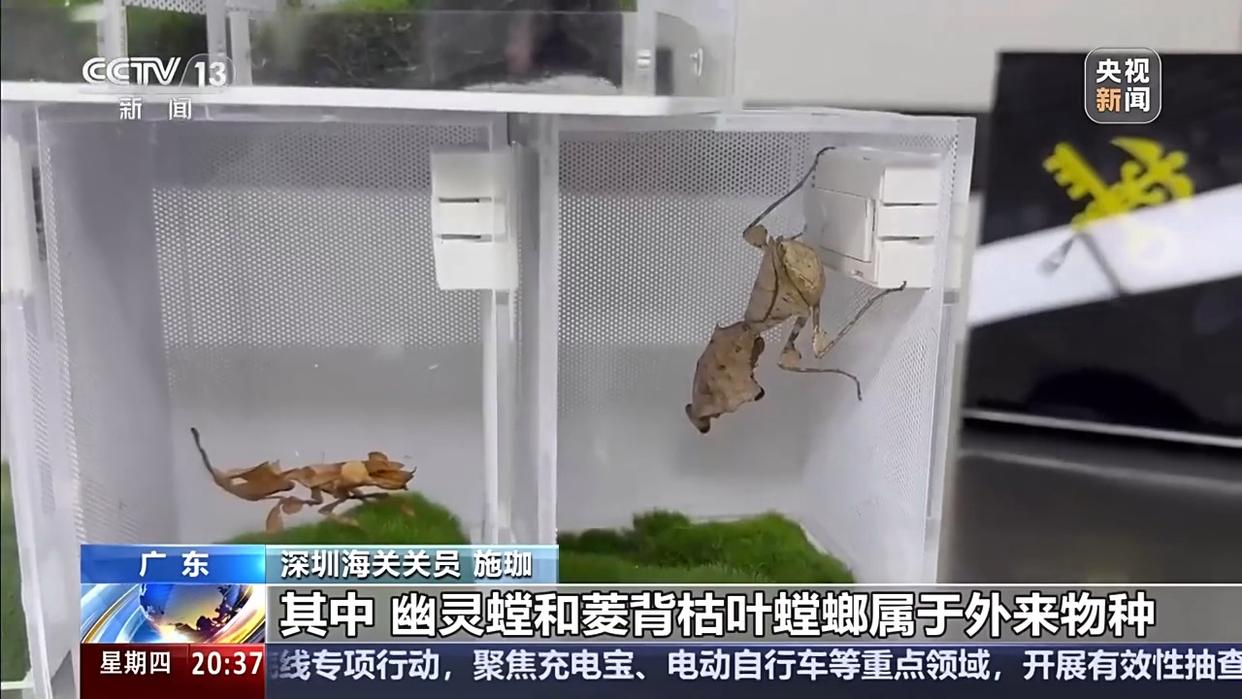 深圳海关关员 施珈:经专业机构鉴定,这批活体螳螂分别为兰花螳螂、幽灵螳、叶顶窄叶螳、叶背螳属和菱背枯叶螳螂,其中幽灵螳和菱背枯叶螳螂属于外来物种。