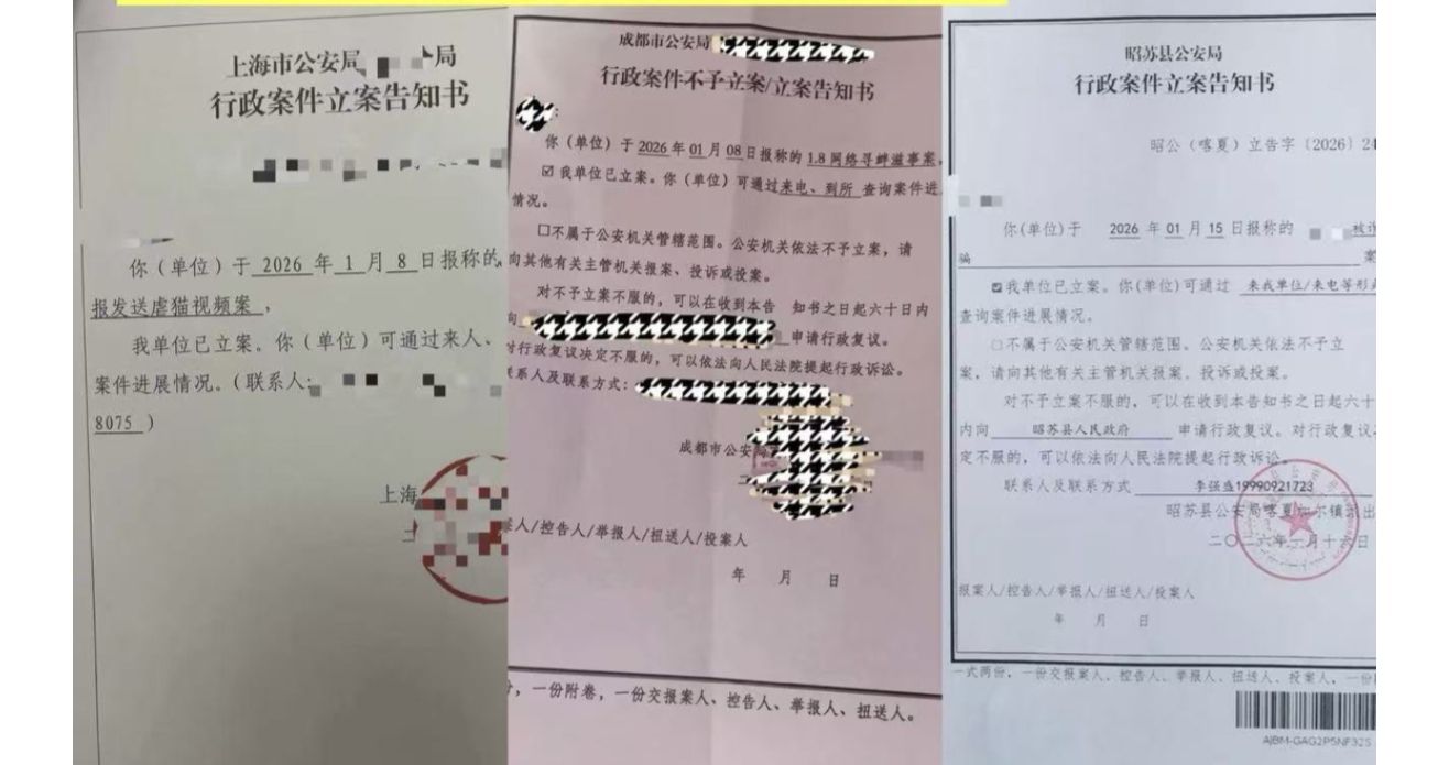 1月8日,“芝麻”和一些动物保护志愿者进行了举报,多地公安机关进行了立案。其中一名26岁的梁姓男子因违反《中华人民共和国治安管理处罚法》被处以行政拘留五日的行政处罚。