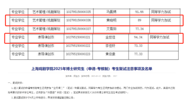 此前,2025年5月12日,上海戏剧学院官方发布了2025年博士研究生的复试名单,有网友在名单中发现了黄晓明,这也意味着其已经通过了初试。