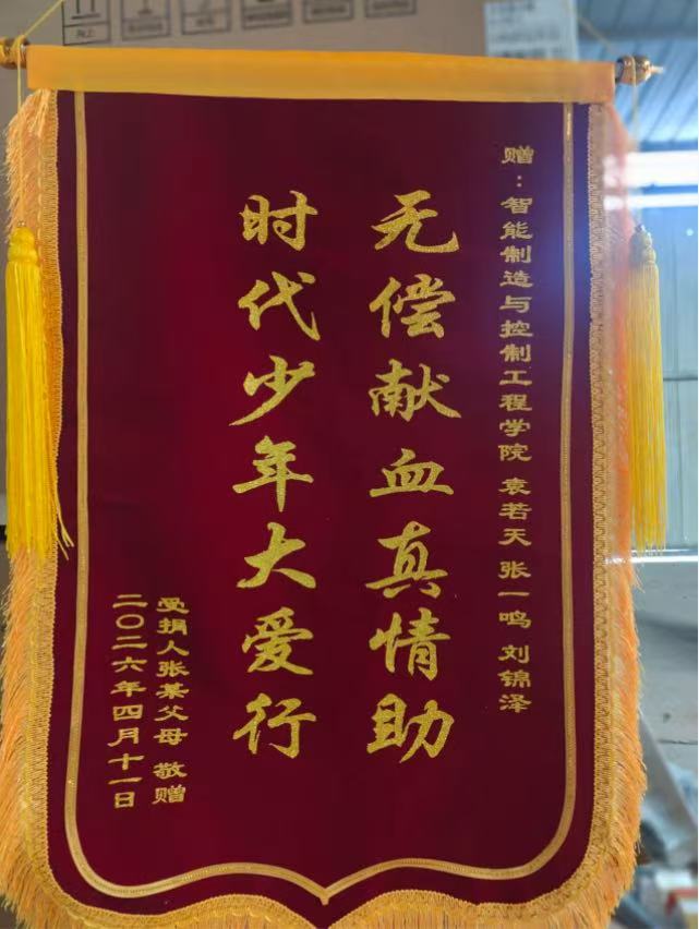 4月16日,山东济宁的张先生将一面锦旗寄到了齐鲁理工学院智能制造与控制工程学院,郑重感谢该院袁若天、刘锦泽、张一鸣三位同学,用无偿献血的“热血”善举,为身患重病的女儿解了燃眉之急。