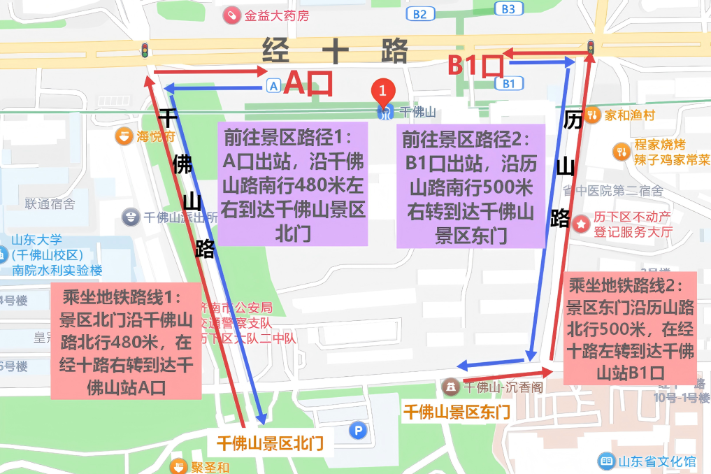 路径2:如您从B1口前往景区,沿历山路南行500米右转到达千佛山景区东门,完美实现地铁与千佛山相亲大会主会场精准衔接。