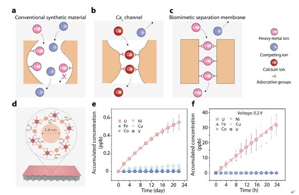 图为受生物通道启发的关键金属离子分离膜构建策略示意图及铀提取性能。(a)传统分离膜,被吸附的离子无法传输;(b)生物钙离子通道,被吸附的钙离子优先传输;(c)仿生分离膜,被吸附的关键金属离子优先传输,实现关键金属离子选择性分离提取;(d)材料分子结构;(e)海水中铀的分离提取性能;(f)电场驱动下海水中铀的分离提取性能。