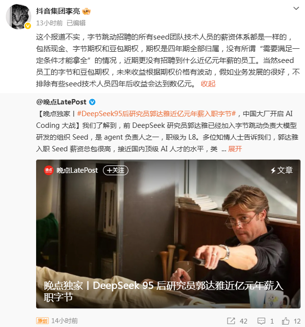 4月16日,针对前DeepSeek研究员郭达雅已经加入字节跳动,并有可能每年拿到近亿元薪酬的相关报道,抖音集团副总裁李亮在社交平台发文表示,“这个报道不实,字节跳动招聘的所有seed团队技术人员的薪资体系都是一样的,包括现金、字节期权和豆包期权,期权是四年期全部归属,没有所谓“需要满足一定条件才能拿全”的情况,近期更没有招聘到什么近亿元年薪的员工。当然seed员工的字节和豆包期权,未来收益根据期权价格有波动,假如业务发展得很好,不排除有些seed技术人员四年后收益会达到数亿元”。