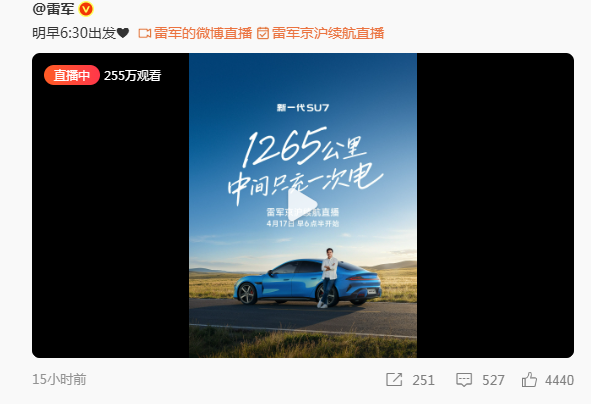 4月17日早上,雷军开启新一代小米SU7从北京到上海的长途续航测试直播。目前已有255万观看。