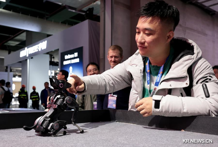 [신화망 중국 충칭 4월17일]"샤오톈(哮天), 손!" 명령이 떨어지자 민첩한 움직임의 로봇개가 진짜 강아지처럼 앉고, 짖더니 심지어 춤까지 춘다.
