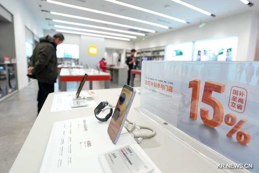 지난 2월 11일 베이징 징둥(京東) MALL 솽징(雙井)점의 한 휴대폰 판매점에 설치된 2026년 국가 보조금 홍보 배너. (사진/신화통신)