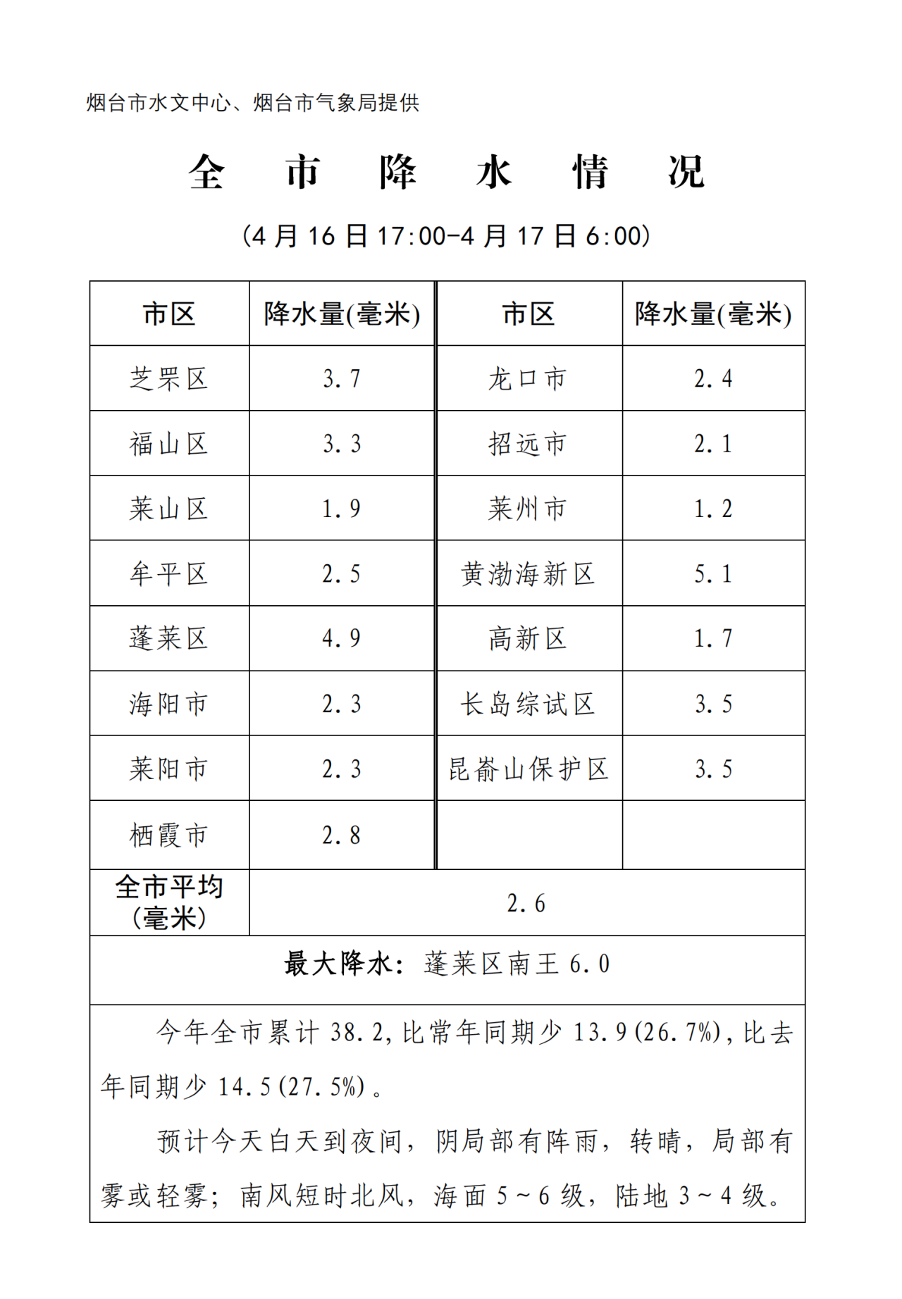 4月16日17时至17日6时,烟台最大降水6毫米,出现在蓬莱