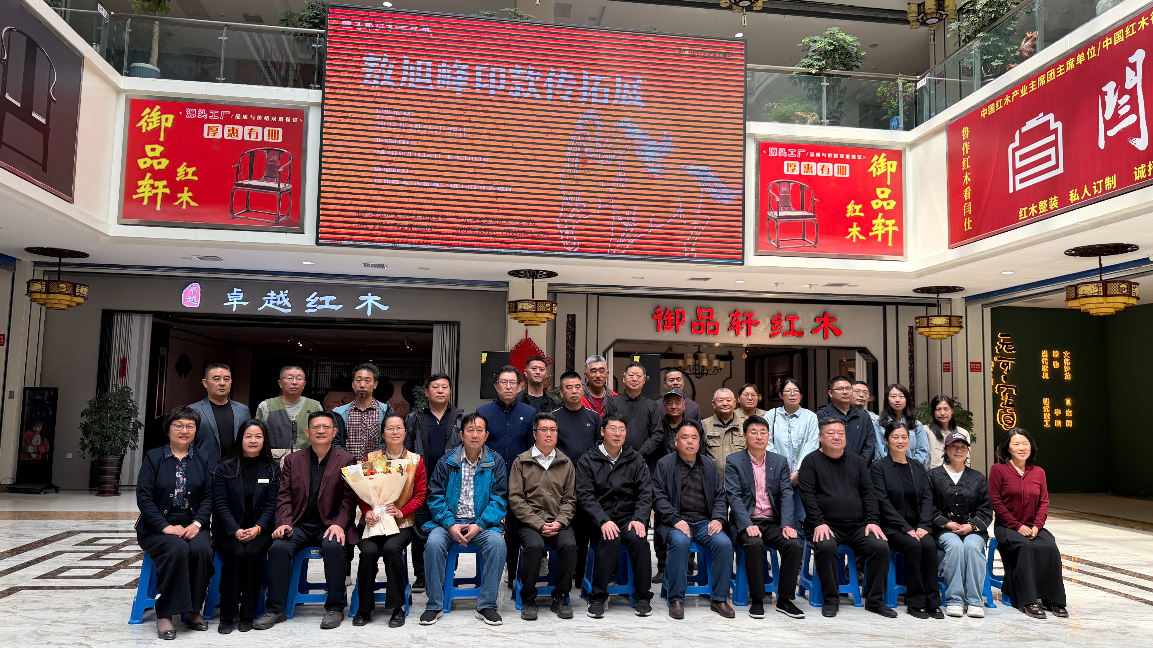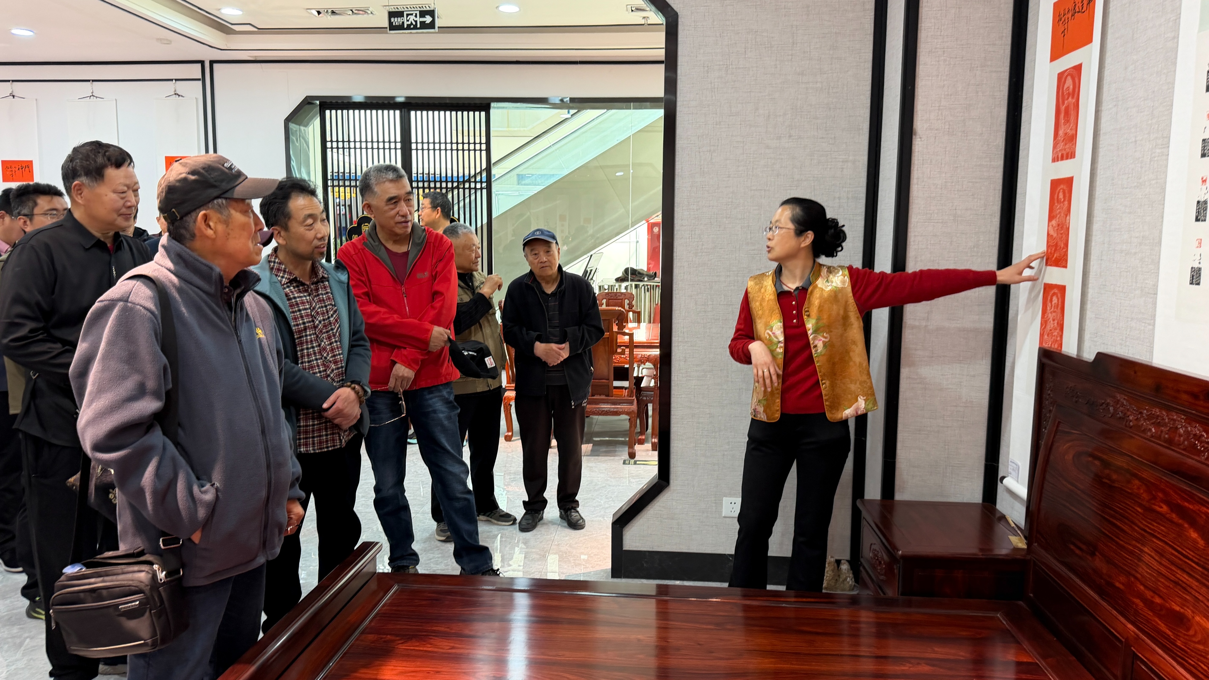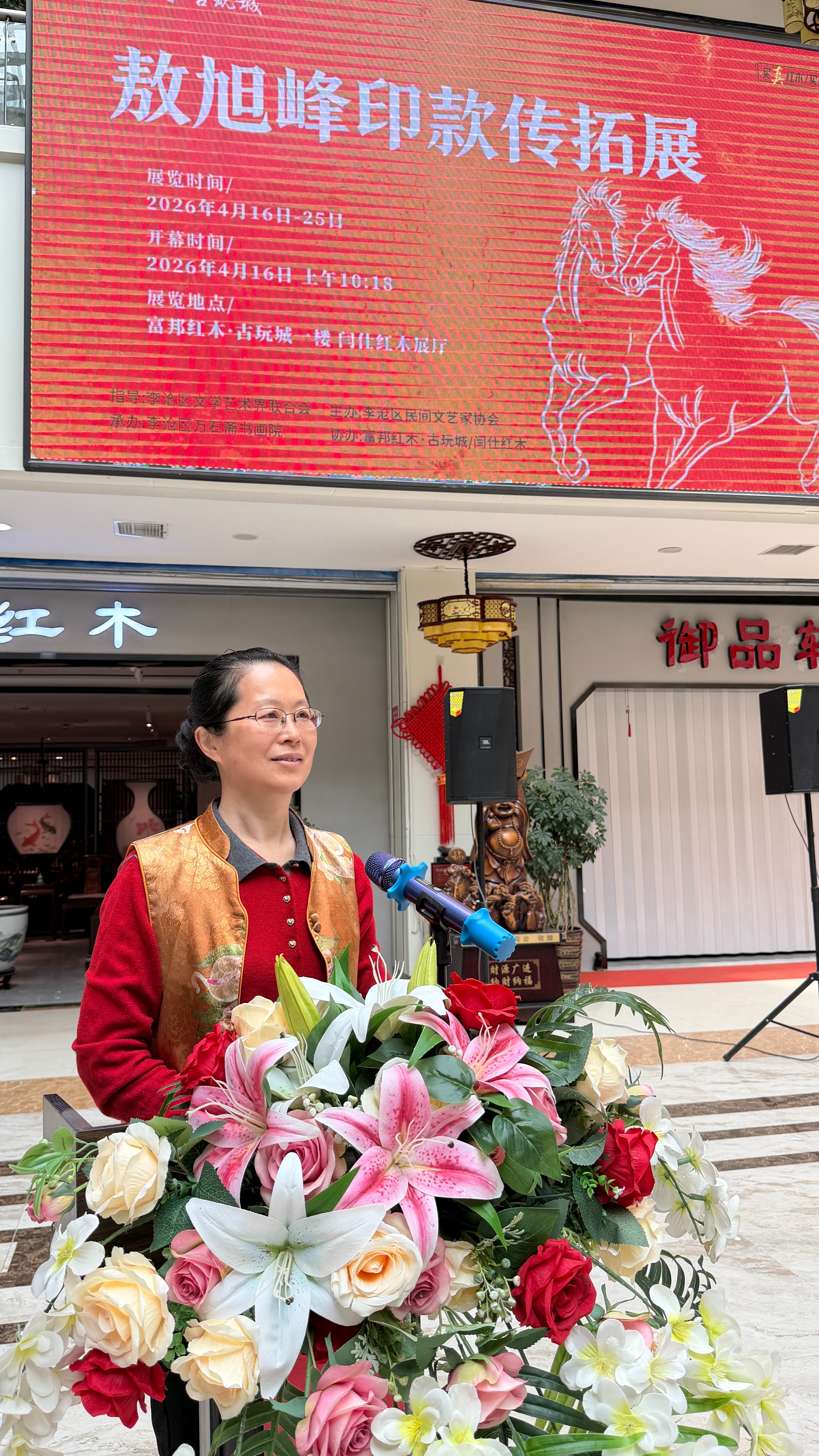 本次展览由李沧区文学艺术界联合会担任指导单位,李沧区民间文艺家协会主办,李沧区万石斋书画院承办,富邦红木古玩城、闫仕红木协办,区委统战部一级调研员,区人大专职常委王加青宣布展览开幕。