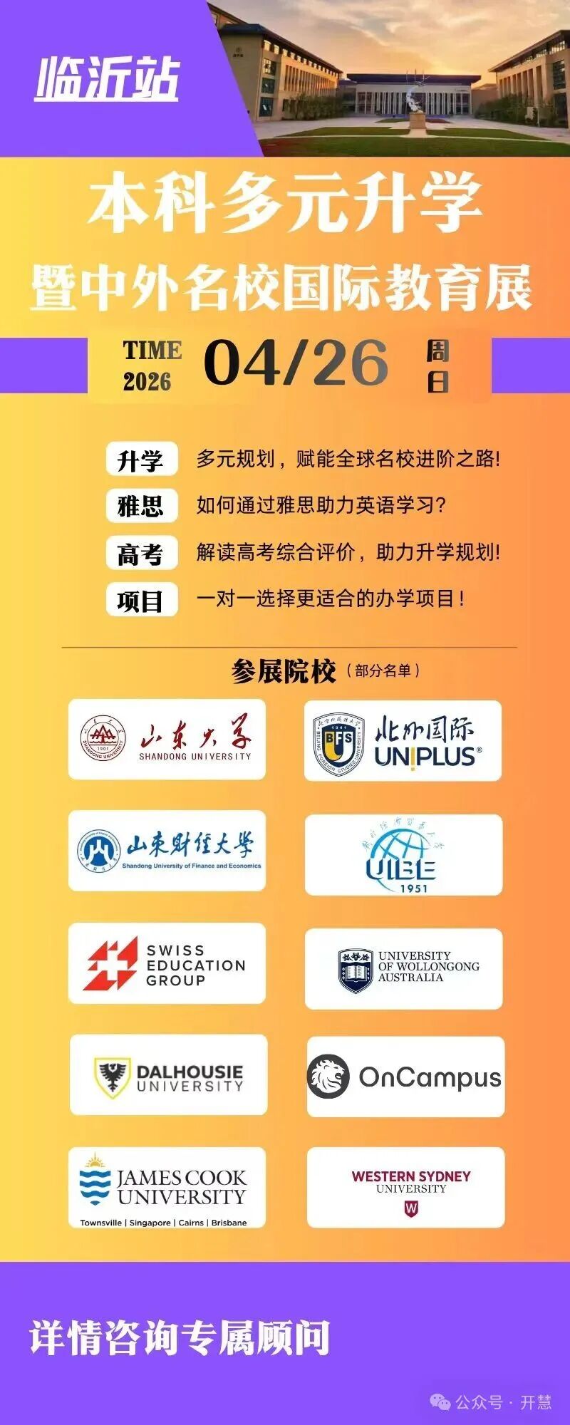 4月26日,2026年临沂国际教育展震撼来袭。一次性逛完20+所优质海内外院校,中外合作办学项目、海外大学、海外中小学国际学校一网打尽,打破信息差,所有择校问题都可以在这里得到想知道的答案。