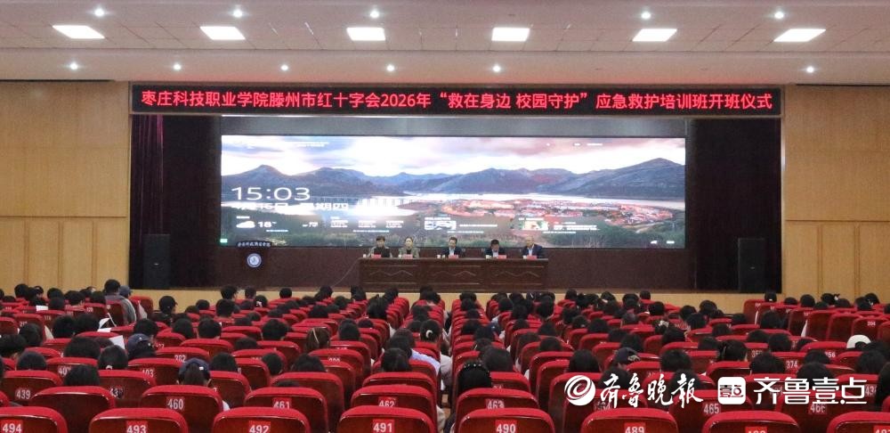 为深入推进应急救护知识技能进校园,提升师生自救互救能力,筑牢校园安全防线,4月16日下午,2026年滕州市红十字会、枣庄科技职业学院“救在身边 校园守护”CPR+AED应急救护培训班开班仪式在学校大学生活动中心隆重举行。学校党委副书记王宜建、医药卫生学院院长刘端海、附属医院院长战则凤,滕州市红十字会党组书记范勇、常务副会长徐冉、山东省红十字会应急救护培训师及350名参训学生、学校负责老师、红十字博爱青春应急救护社团成员共同参加活动。开班仪式由战则凤主持。