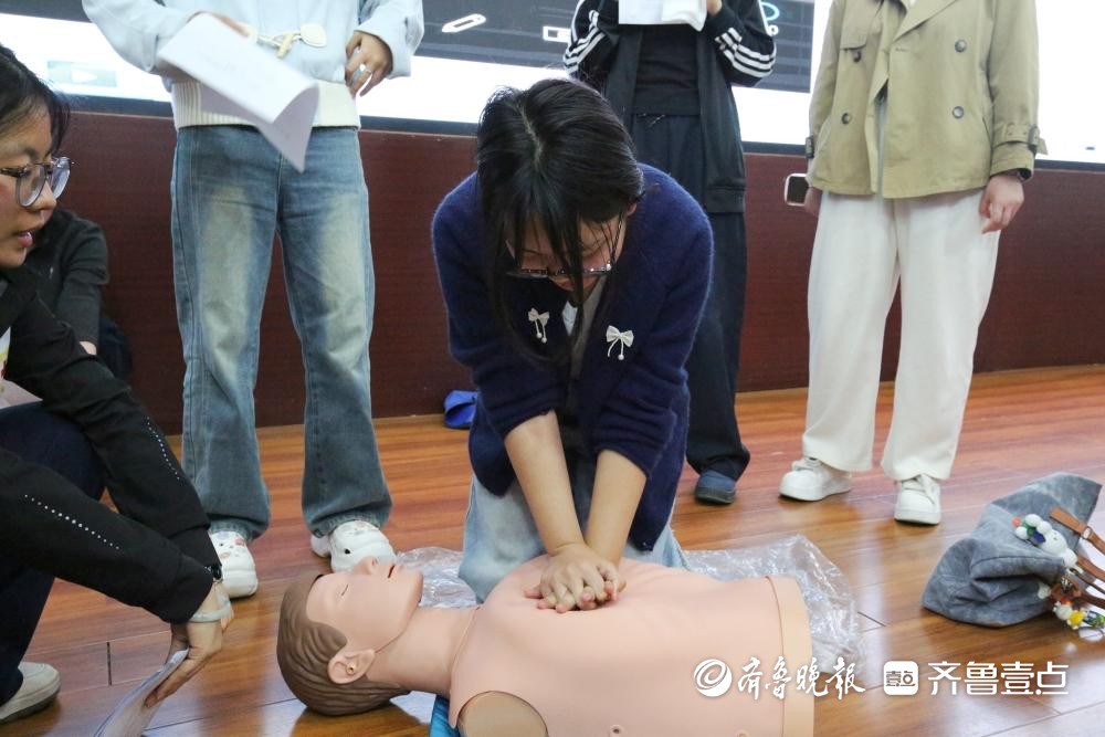 随着主持人宣布培训正式开始,350名参训学生在山东省红十字会应急救护培训师的指导下,开启了为期3个小时的CPR+AED应急救护专项培训。