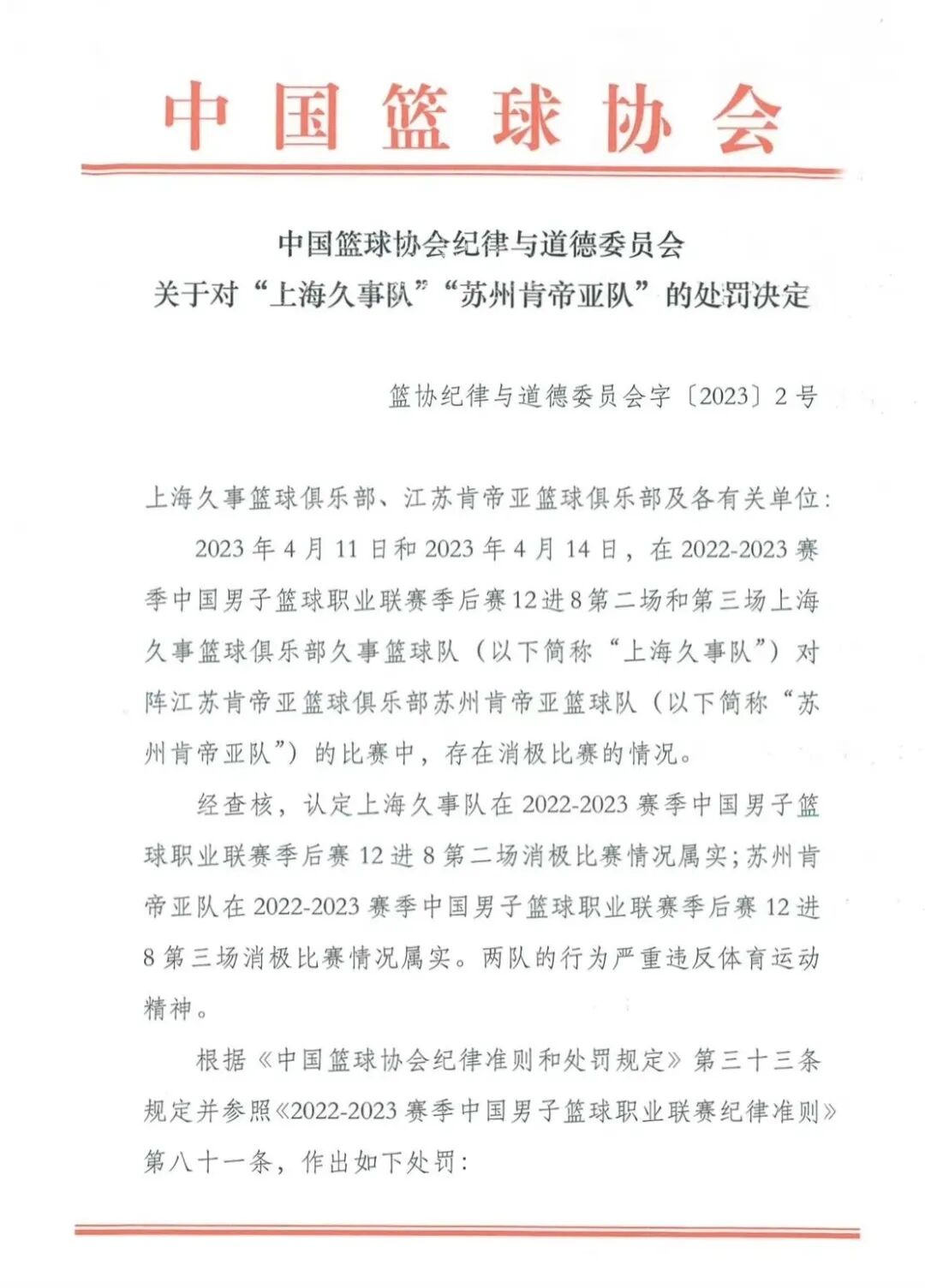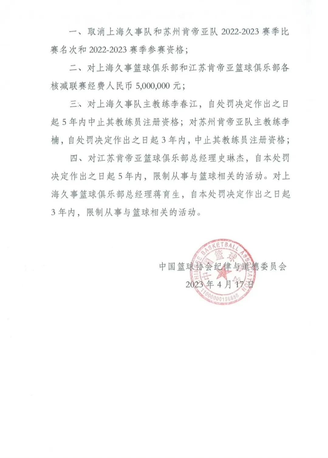 据央视新闻,2023年4月17日,中国篮协发布关于上海久事男篮对阵苏州肯帝亚男篮比赛的处罚决定: