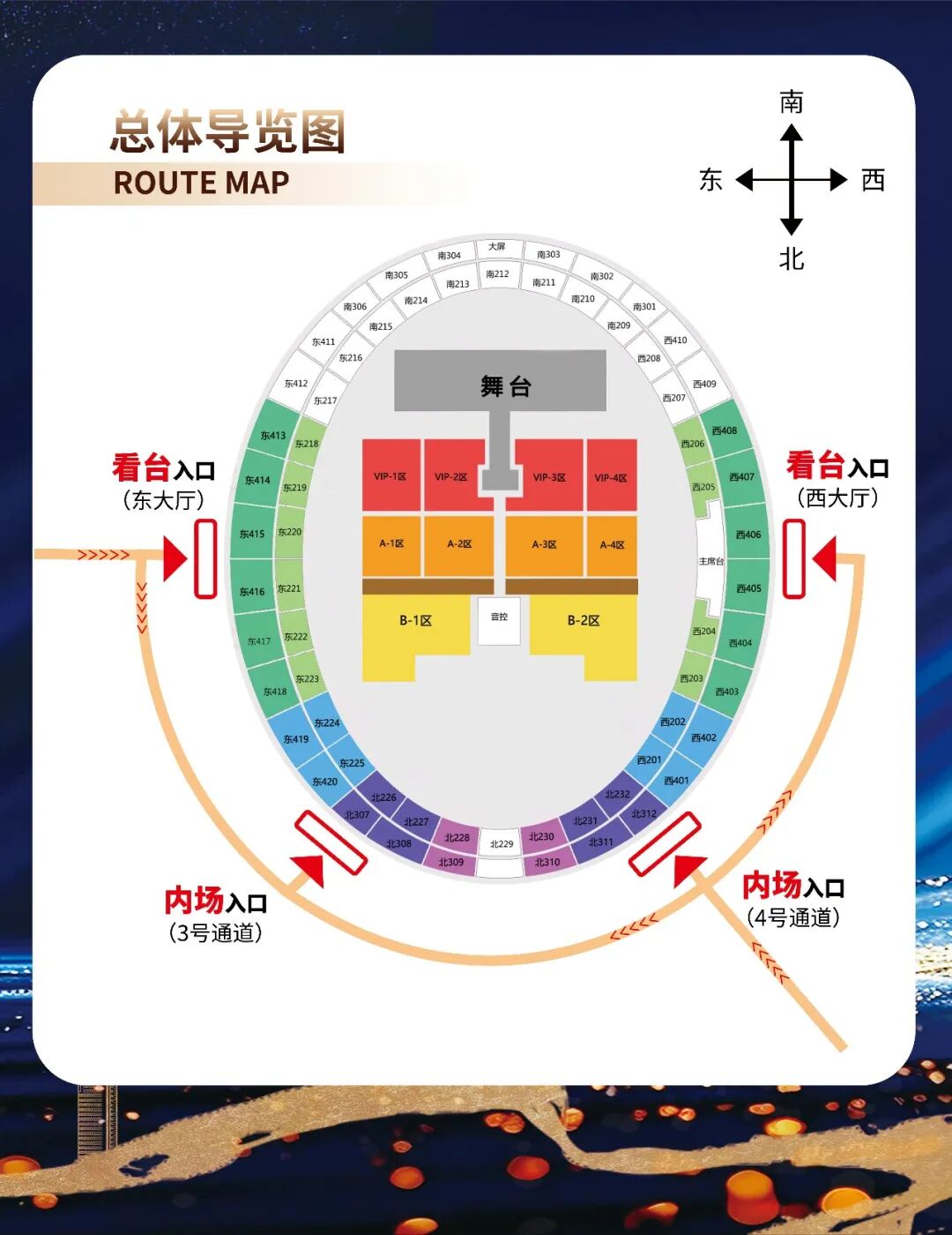 本场演唱会进场动线已作规划,搭配以下进场示意图,请持有不同区域门票的歌迷按照指引有序进场,快速找到观演位置就坐: