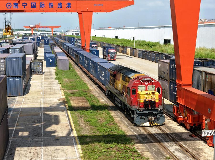 An aerial drone photo taken on Sept. 23, 2025 shows a China-Vietnam freight train pulling out of the Nanning International Railway Port in Nanning, south China's Guangxi Zhuang Autonomous Region. (Xinhua/Xing Guangli)