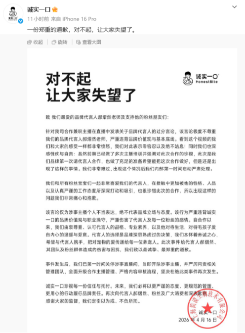 “诚实一口”当日发布声明致歉,将其定性为“兼职主播个人不当表达”,宣布关停涉事直播间、开除主播。“诚实一口”在声明中表示,针对我司合作兼职主播在直播中发表关于品牌代言人的过分言论,该言论极度不尊重我们的品牌代言人郝熠然老师,严重违背品牌价值观与基本底线。看到这个视频的我们和大家的感受一样都非常愤怒,我们对此表示零容忍以及绝不姑息!同时我们也深感愧疚与自责:虽然前期已经做了多次主播培训并强调对此次合作的珍视,此次是我们品牌第一次请代言人合作,也做了充足的准备希望能把这次合作做好,但是还是出现了这样的事情。我们非常难过,出现这个情况后我们内部第一时间启动严肃处理。