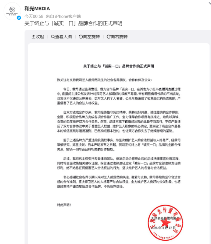 鉴于上述品牌方严重违约及侵权事实,为坚决维护艺人的合法权益与人格尊严,和光传媒自本声明发布之日起,正式终止与诚实一口品牌的全部合作关系,撤销一切与该品牌相关的合作授权。