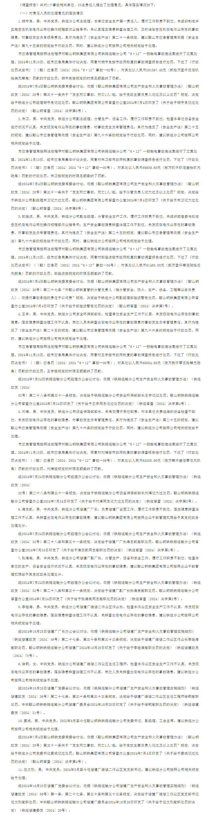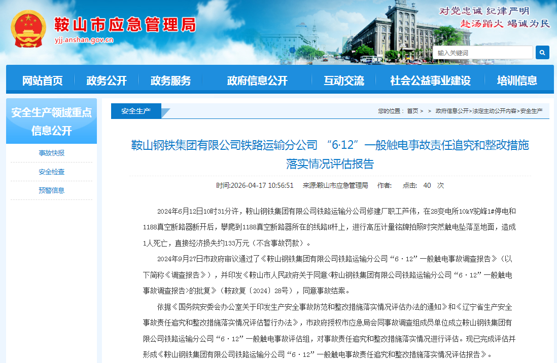 齐鲁晚报·齐鲁壹点记者于辽宁省鞍山市应急管理局政府信息公开栏获悉,4月17日,鞍山市应急管理局发布《鞍山钢铁集团有限公司铁路运输分公司“6·12”一般触电事故责任追究和整改措施落实情况评估报告》(以下简称《报告》)。