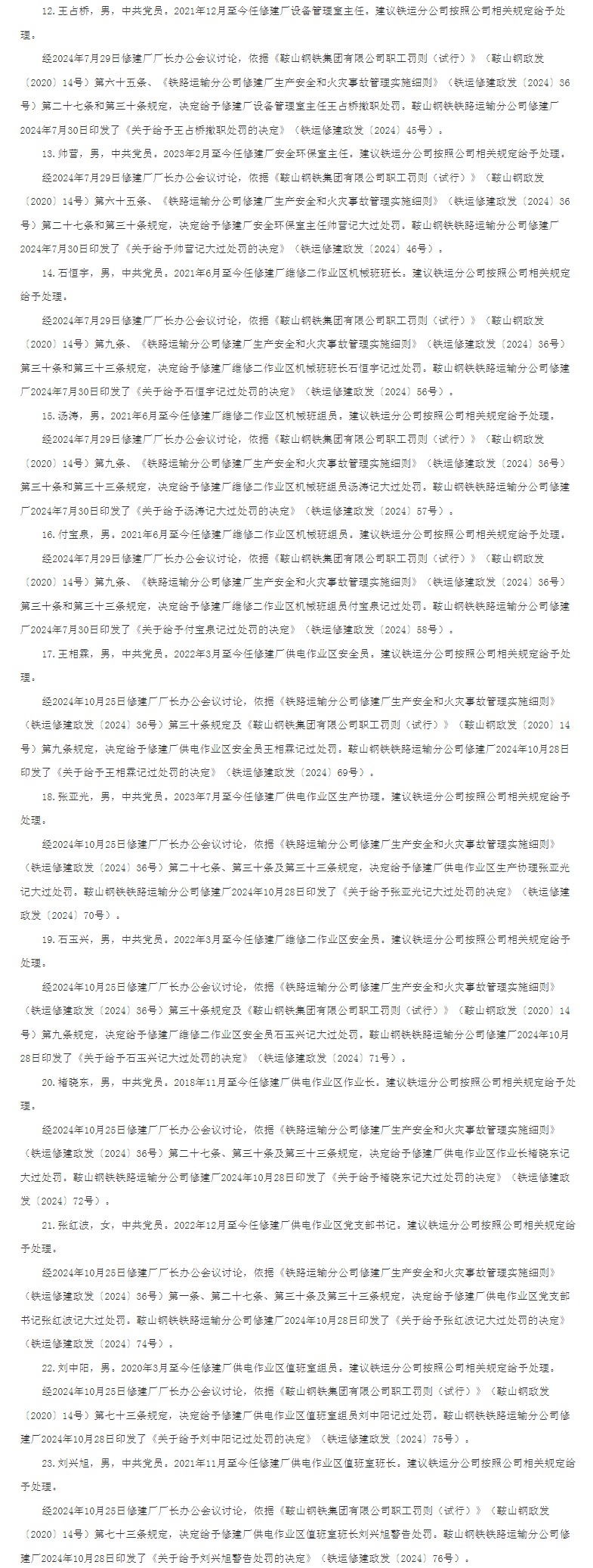 其中,鞍钢铁运分公司被处以50万元的行政处罚;该分公司总经理胡守良被处以201597.4元罚款并受到记过处罚;分管生产、设备工作的副总经理宋卫被处以89939.6元罚款并受到记大过处罚;分管安全生产工作的副总经理邹继波被处以81465.8元罚款并受到警告处罚;该分公司安全环保部部长王宇被处以68054.6元罚款并受到记过处罚;设备保障部部长刘博被处以64305.9元罚款并受到记大过处罚;此外,修建厂厂长海志凯、副厂长张海亮等多人被分别给予撤职、记大过、记过等处罚。