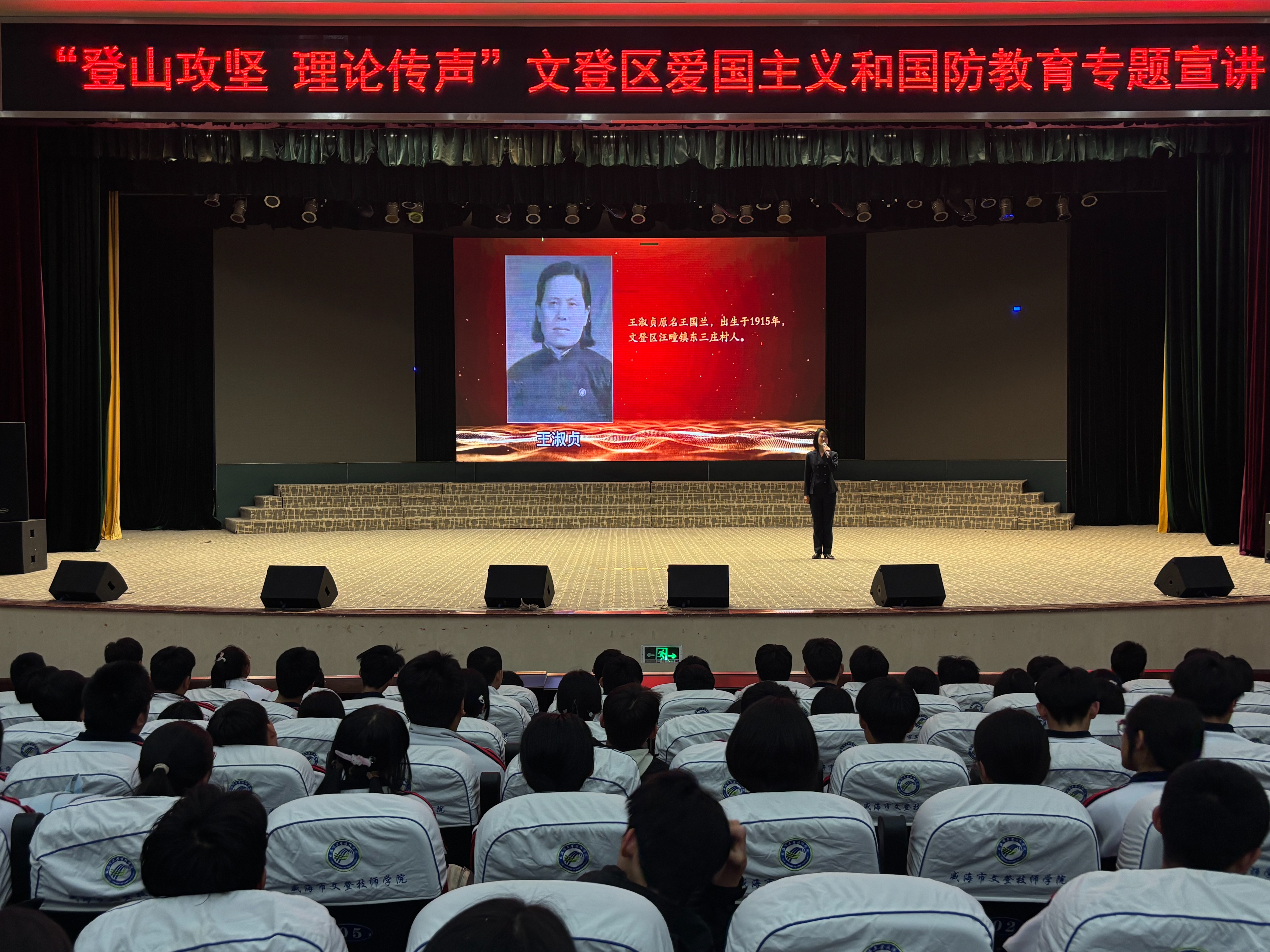 为助力“十五五”规划开好局、起好步,大力弘扬“志存高远、坚韧不拔、团结协作、勇攀高峰”的登山精神,近日,“登山攻坚 理论传声”文登区基层理论宣讲活动在技师学院礼堂举行,本次宣讲主要围绕爱国主义和国防教育专题,来自天福山红色宣讲团的宣讲员们为现场师生带来一场深刻的思想洗礼与精神盛宴。