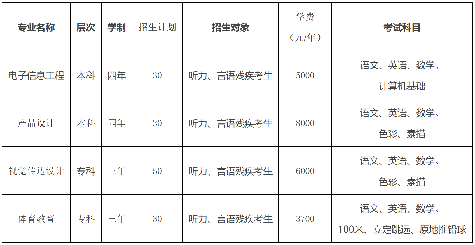 产品设计、视觉传达设计、体育教育专业面向全国招收具有高级中等教育毕业或同等学历,生活能够自理的听障学生。