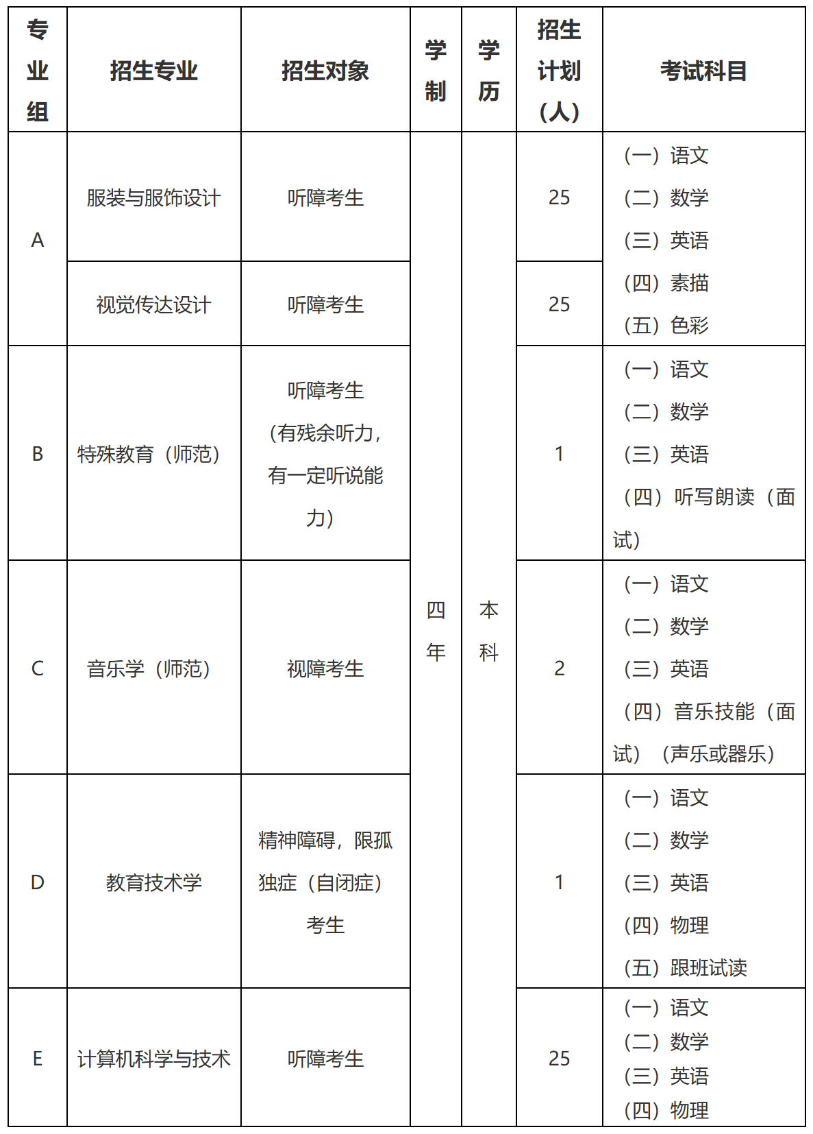 1.招生对象为符合全国普通高校招生体检标准,具有高中毕业或同等学力,持有残疾证明的听力残疾、视力残疾或轻度精神残障的考生。