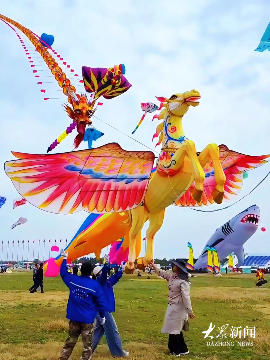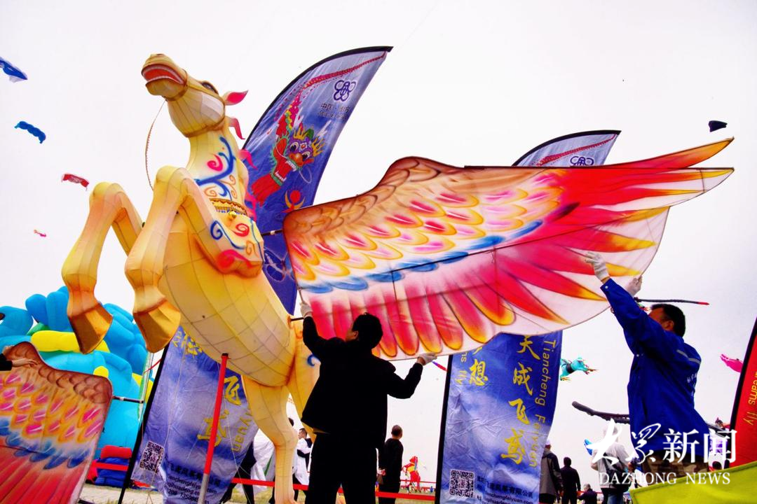 高度近5米的立体飞马,牵引着长达120米的龙头蜈蚣,在蓝天之上气势如虹。这是国家级非物质文化遗产代表性项目潍坊风筝市级代表性传承人王永训今年的风筝新作——《龙马精神》。