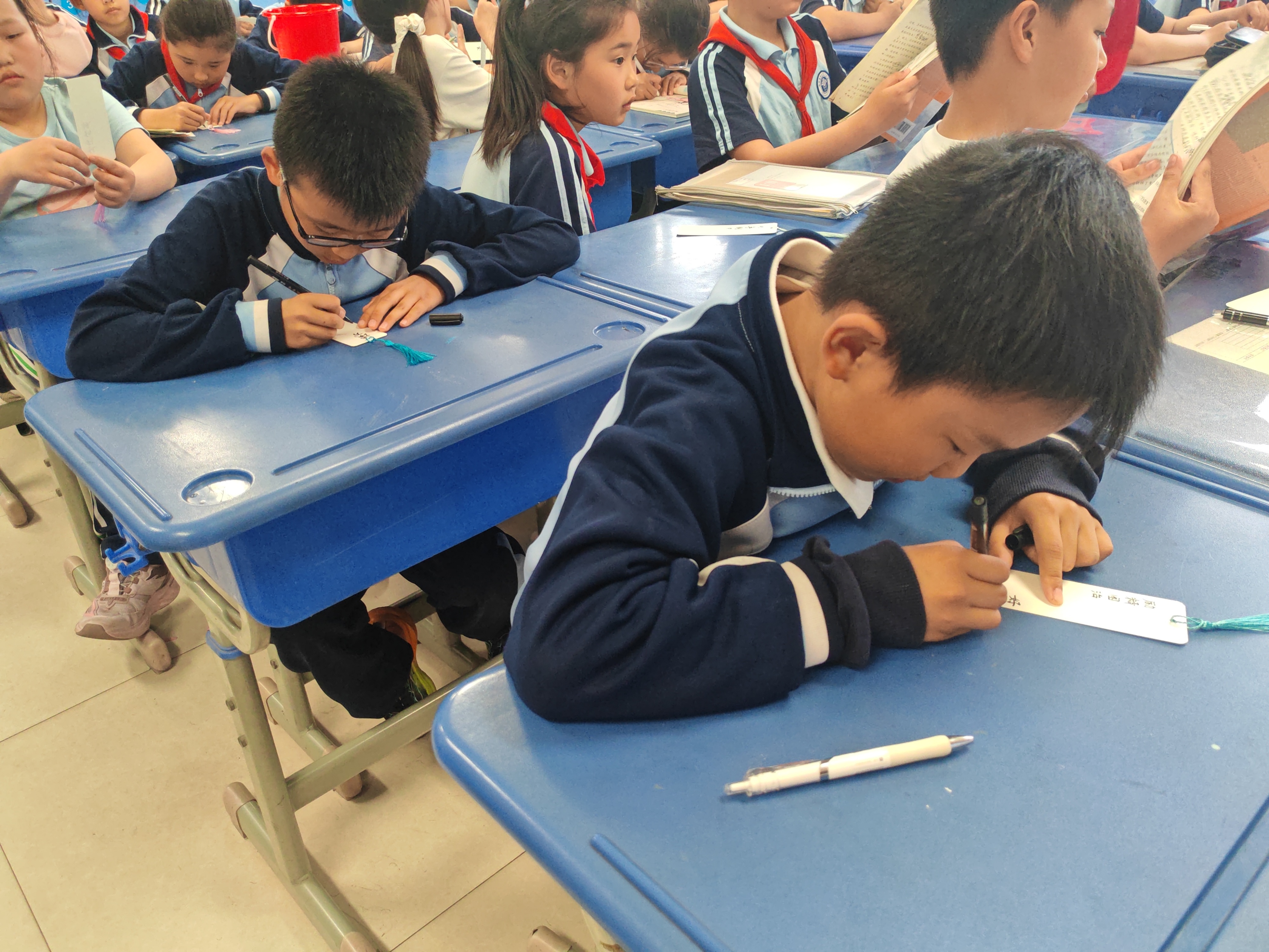 在动手实践环节,志愿者为孩子们分发空白书签,一步步示范漆艺书签的绘制、上色、装饰技巧,引导孩子们将自己的读书感悟、阅读心愿、喜爱的书香元素融入书签创作中。孩子们兴致高涨、全神贯注,有的写下“读书破万卷”等经典读书名言,有的勾勒灵动可爱的图案,孩子们将写好的书签用漆艺上色,每个孩子都得到了一个精美独特的书签。